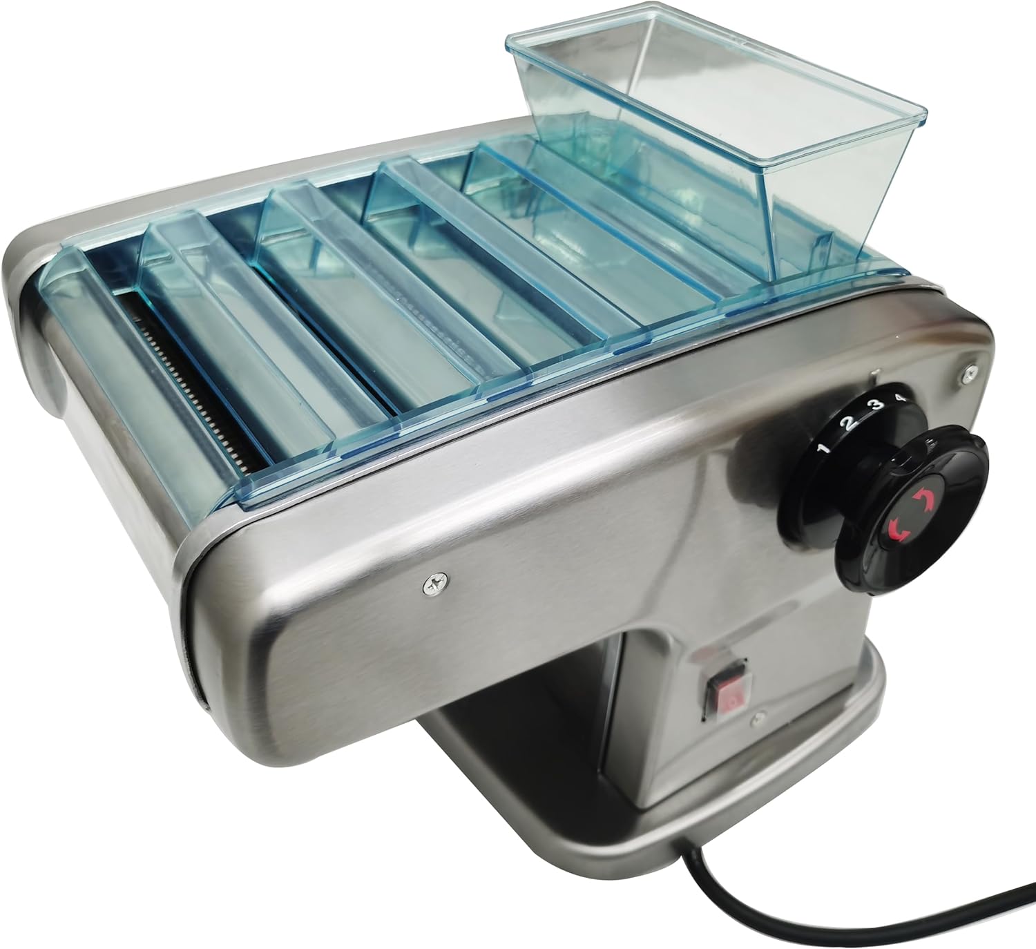This household small pasta press machine is designed for both restaurants and family use, making it versatile and practical.You can create various types of noodles with different widths, including 2mm, 4mm, 9mm-Flat and 2.5mm Round.The thickness adjustment knob offers 9 gears for precise control, allowing you to customize the thickness of your pasta crust.Safety is our priority, which is why we've included an ABS protective cover.This cover not only prevents accidental contact with the knife rollers but also adds an extra layer of durability. Additionally, the removable hopper makes cleaning and maintenance a breeze.The adjustment knob serves a dual purpose, allowing you to both pressure noodles and cut noodles. By simply protruding or sticking in the knob, you can effortlessly press the dough or cut noodles as desired. With its user-friendly design, this machine offers convenience and versatility in one.Specifications:Model: Four blade typeMaterial: Stainless steelVoltage: AC110VPower: 135WTypes of noodles: 2mm, 4mm, 9mm-Flat and 2.5mm RoundItem Number: ENT020439