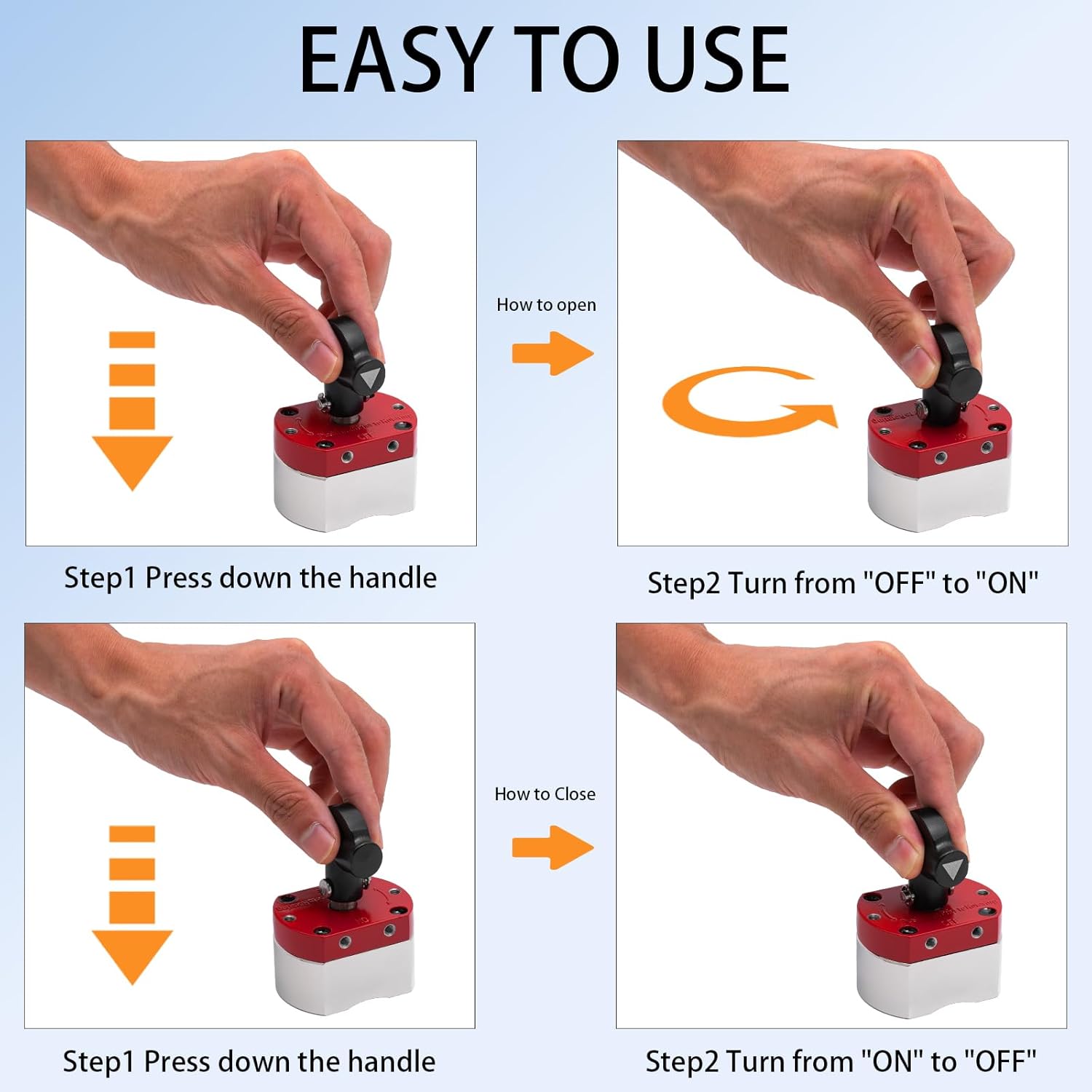 Product Description:Struggling with heavy-duty tasks like lifting, positioning, or metal separation? Our Multipurpose Switch Magnet is here to simplify your work. It's a must-have for professionals in manufacturing, welding, and DIY enthusiasts alike, offering a seamless solution for a wide range of projects.Key Features:High-Strength Magnetism: Achieve maximum suction with a 180-degree handle rotation.Sturdy Design: Made with aluminium alloy and low-carbon steel for longevity.Toggle Control: Easy ON/OFF switching for precise magnetic control.Safe to Use: Automatically releases metal when OFF to prevent injuries.Waterproof: Suitable for wet tasks with oil-sealed internal parts.Specifications:Pull-Off Force: 180 LBShape: RectangularPackage Dimensions: 4.09 x 2.87 x 2.13 inchesPackage Weight: 1.3 PoundsMaterial: Aluminium handle and low-carbon steel caseSwitch: ON/OFF metal gearsWaterproof: Oil-sealed main internal partsPackage Content:1 x Multipurpose On/Off Magnet