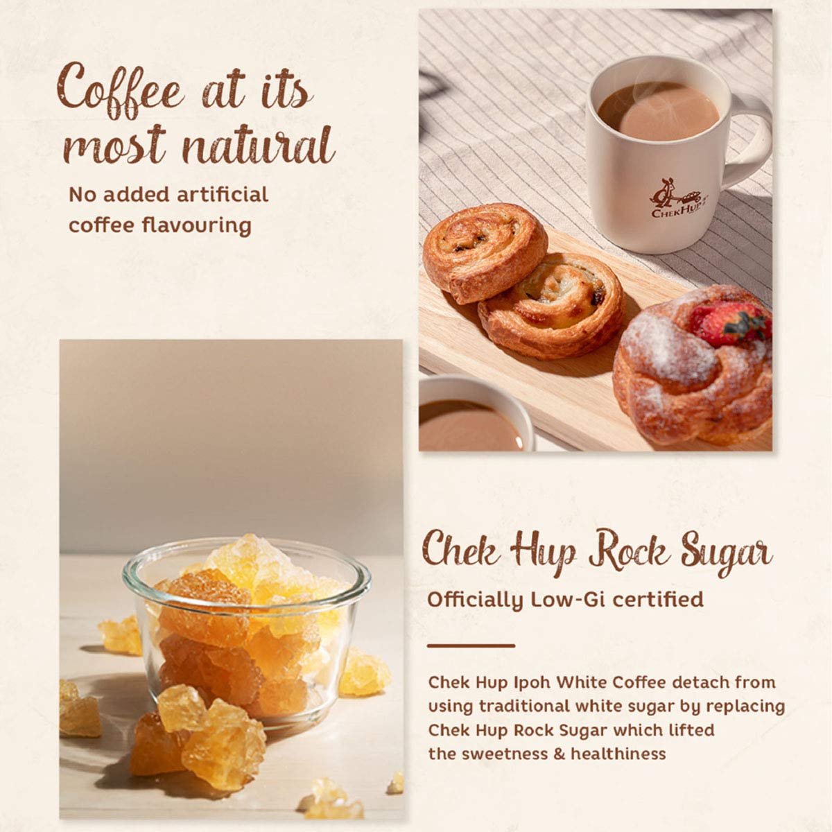 Chek Hup 3 in 1 Ipoh White Coffee - Original For coffee aficionados who appreciate the authenticity, here is a fine blend of medium roasted premium coffee beans from Africa and Asia. Enjoy the authentic smooth taste and fragrant aroma of white coffee.