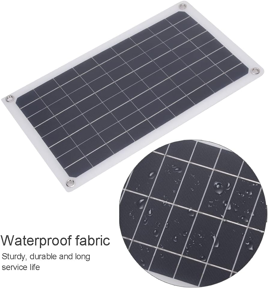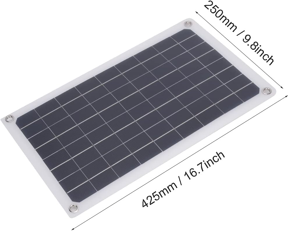 [HIGH-QUALITY MATERIAL] The solar panel features grade A monocrystalline silicon, ensuring durability and reliability in outdoor conditions.[VERSATILE USE] for 12V battery charging, with added backflow protection to safeguard your devices.[ECO-FRIENDLY DESIGN] This solar panel charger is battery-, promoting environmental sustainability and safety during use.[LIGHTWEIGHT PORTABLE] Experience easy and convenient charging on the go, ideal for outdoor activities such as camping, hiking, and more.[SMART VOLTAGE CONTROL] Enjoy regulated output and stable power delivery, compatible with various devices and household appliances.Spec:Item Type: Solar Panel ChargerMaterial: Grade A monocrystalline silicon solar panelConversion Rate: 19.5%Power: 20W peakWorking Voltage: 18V Current: 0-1000MAVoltage: 5V(dual USB output)Current: 0-1000MA(regulated)Temperature: 60 to -40℃Solar Panel Size: Approx. 425 x 250mm / 16.7 x 9.8inPackage List:1 x 20W Solar Panel1 x Clip Cable1 x Dual USB Car Charger1 x Cigarette Lighter1 x DC 1pc Female to 2pcs Male Cable(cable length is about 40mm, based on the actual product)Note:The intensity of the LED indicator depends on different conditions. If it blinks weakly, don't worry, it's not a quality problem.