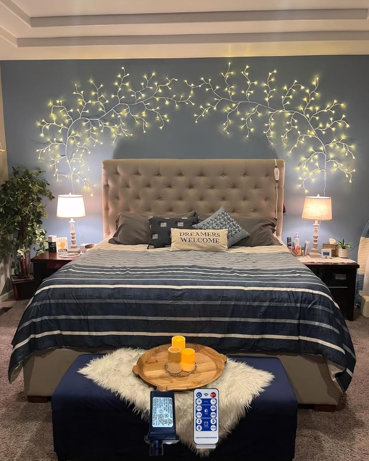 WILLOW VINE 90" W 144 LED'S 78'‘ wired, willow vine highlighted by 144 warm white LED bulbs.Beautiful handmade art decoration: This lamp has a beautifully crafted appearance, distributed on 18 branches with 144 stunning LEDs, it is gorgeous, elegant and brings a touch of natural serenity to your home.Soft and comfortable lighting: This lamp provides a soft, warm light that is easy on the eyes and creates a cozy, comfortable atmosphere. It can be used for any holiday celebration or just to add a touch of warmth to your home.DIY Bendable realistic vine: All branches and twigs are flexible, sturdy, and easy to shape, accommodating your decorating needs, allowing you to add flowers or ornaments as you desire to create a unique atmosphere.High-quality packaging and accessories: This vine light set includes 2 willow vine light, 2 power adaptor, 2 remote,and 2 instruction manual. The lighted willow vine is about 8 feet long, with a long enough 83-inch cord and low voltage transformer that plugs into an outlet, providing convenience without the need for batteries.Easy to install: This lamp does not come with a stand or wall mount. But it comes fully assembled and requires only simple operation including preparing some rope hooks, adhesive strip, or wire holders to hang it where you desire, allowing a fast, simple and stress-free installation.