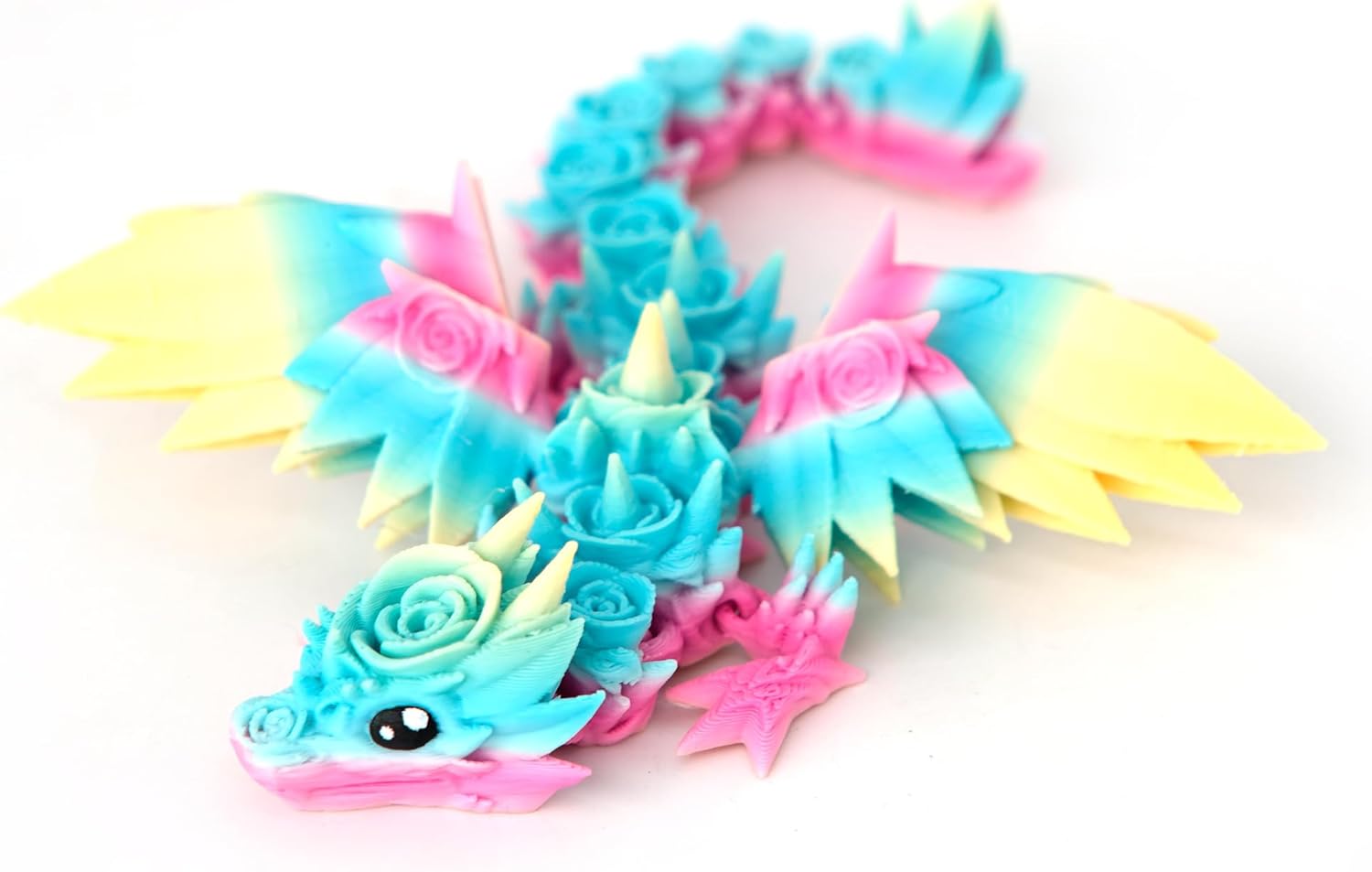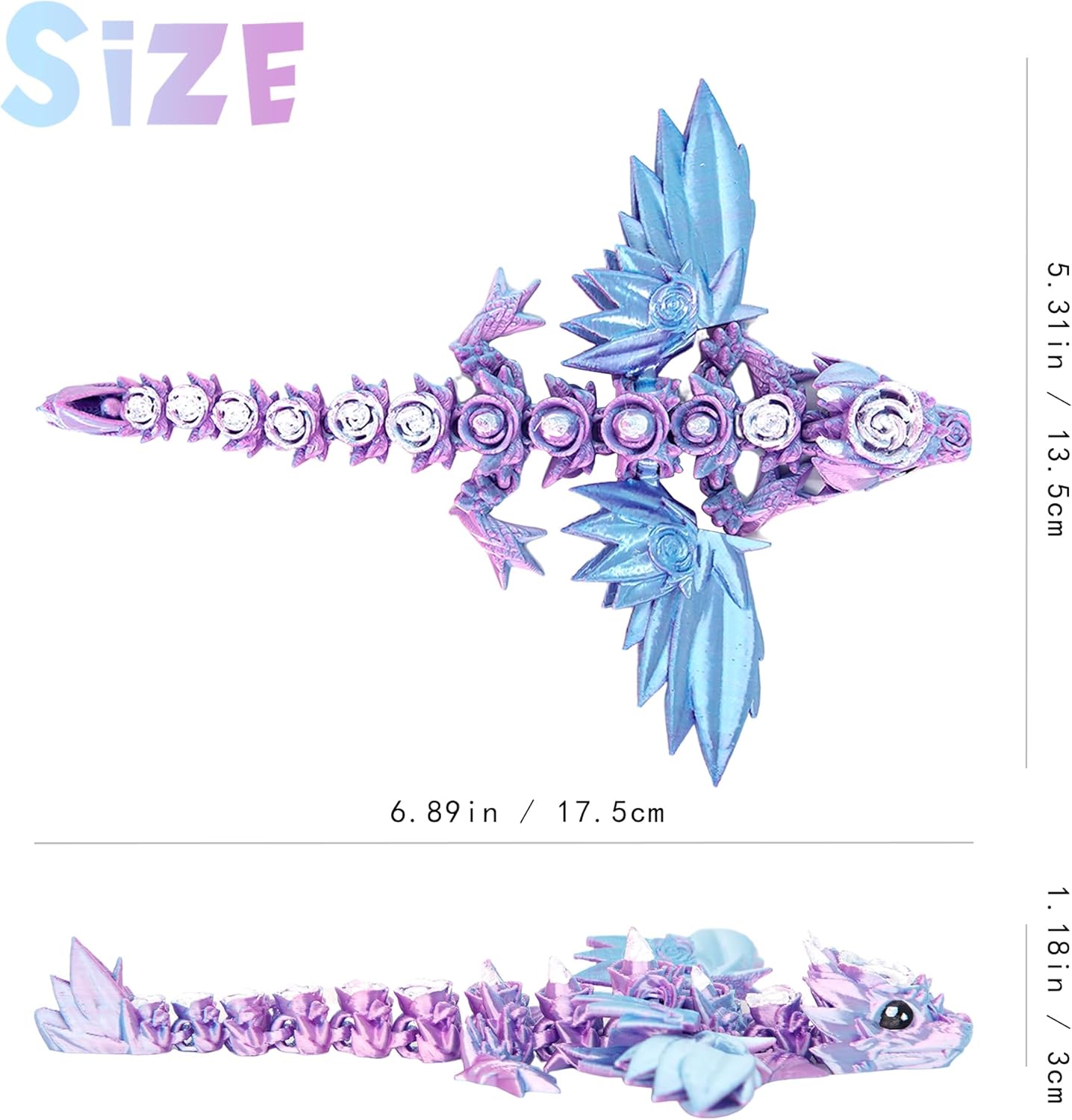 Add a touch of elegance to any room with this articulated rose dragon decoration. This desk fidget is the perfect decoration for any Rose lover. This articulated rose dragon is the perfect gift for someone who loves roses! Crafted from high-quality materials Silk PLA. Whether you're a dragon lover or simply looking for a unique gift, this customizable dragon figurine is sure to impress. It can serve as a striking decor piece, a special addition to your collection, or a thoughtful gift for a loved one.* Please note that 3D printed items are made by adding very thin layers of plastic, one layer at a time. Slight imperfections / rough edges are expected, but I work hard to avoid them. * Please note that while 3D printed items are made of plastic, they can break if used too vigorously. So parental supervision advised.