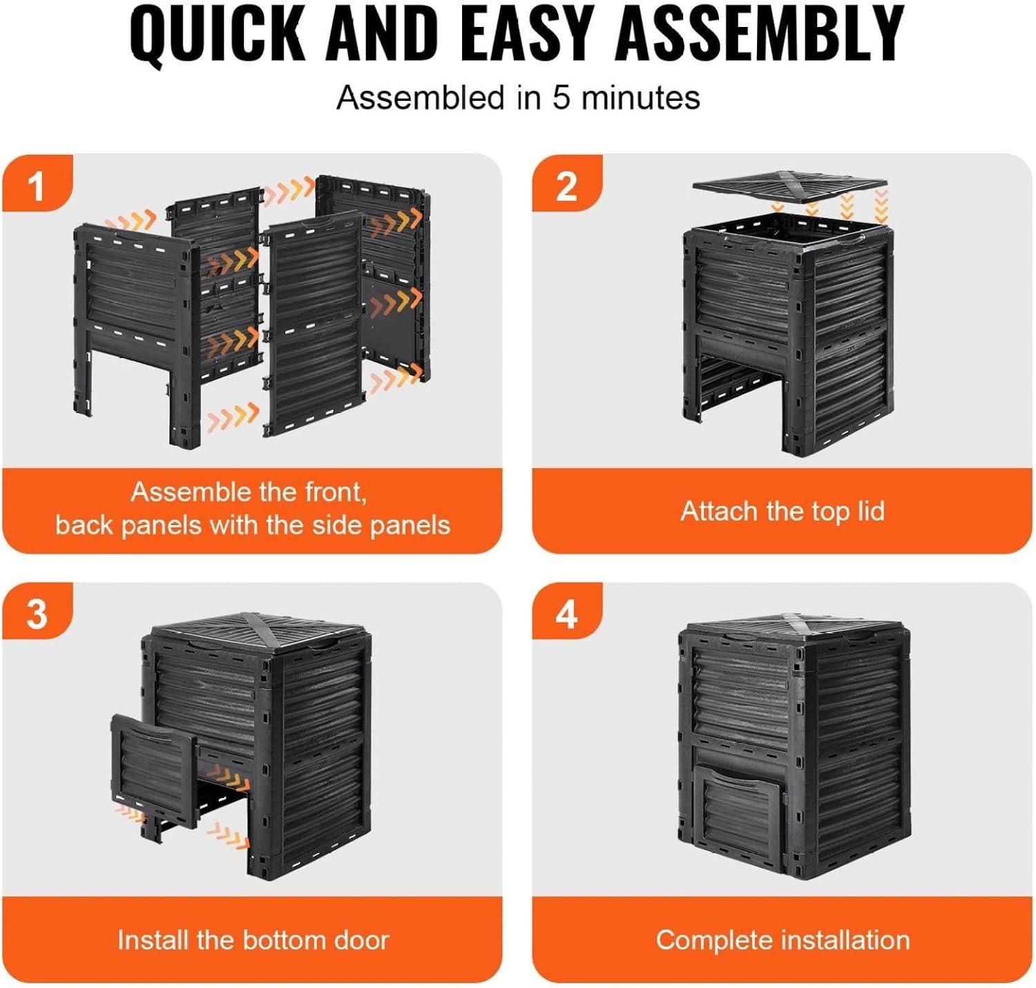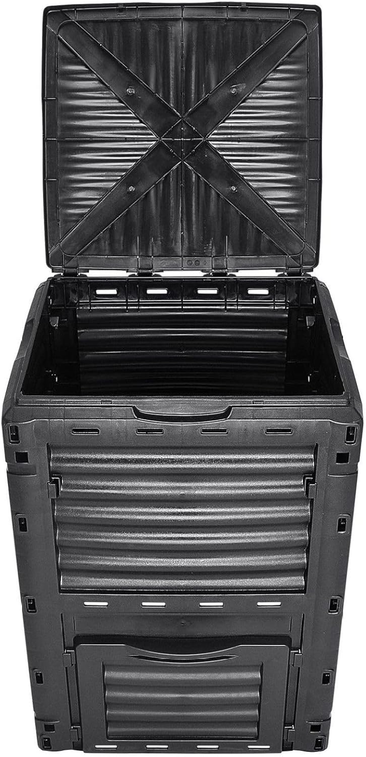 Transform your kitchen and yard waste into nutrient-rich compost with our 80-gallon outdoor compost bin. Designed for efficient decomposition, this composter features four-sided ventilation to accelerate the composting process and a generous 300L capacity to minimize maintenance. Constructed from durable, UV-resistant, and BPA-free polypropylene plastic, it withstands harsh weather conditions while promoting optimal heat retention for faster results. The secure top lid prevents pests and stabilizes the bin, while the convenient bottom door allows for easy compost removal. This lightweight and easy-to-assemble composter is ideal for gardeners of all levels looking to create fertile soil naturally. Dimensions: 33.5"L x 33.5"W x 39.4"H. Material: Polypropylene Plastic. Capacity: 80 Gallons/300 Liters. Color: Black. Assembly Time: Approximately 5 minutes. Features a locking lid and pull-out bottom door for convenient use. Perfect for composting leaves, grass clippings, food scraps, and other organic materials. Experience a sustainable and rewarding way to enrich your garden.