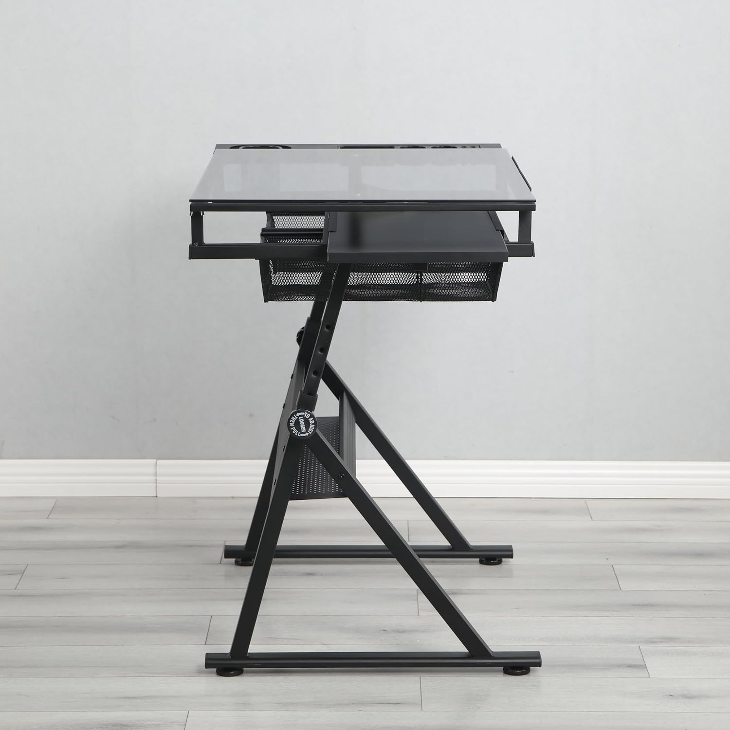Tabletop can be tilted: The desktop is made of 5mm thick tempered glass transparent material, which has good light transmittance. the desktop can be tilted from 0 to 75°. Plenty of storage space:It has two large-size metal drawers. There are metal storage strips on the side to store pens, paints, etc.The bottom of the table legs are equipped with adjustable angles, suitable for use on any uneven ground. The table is equipped with stools.