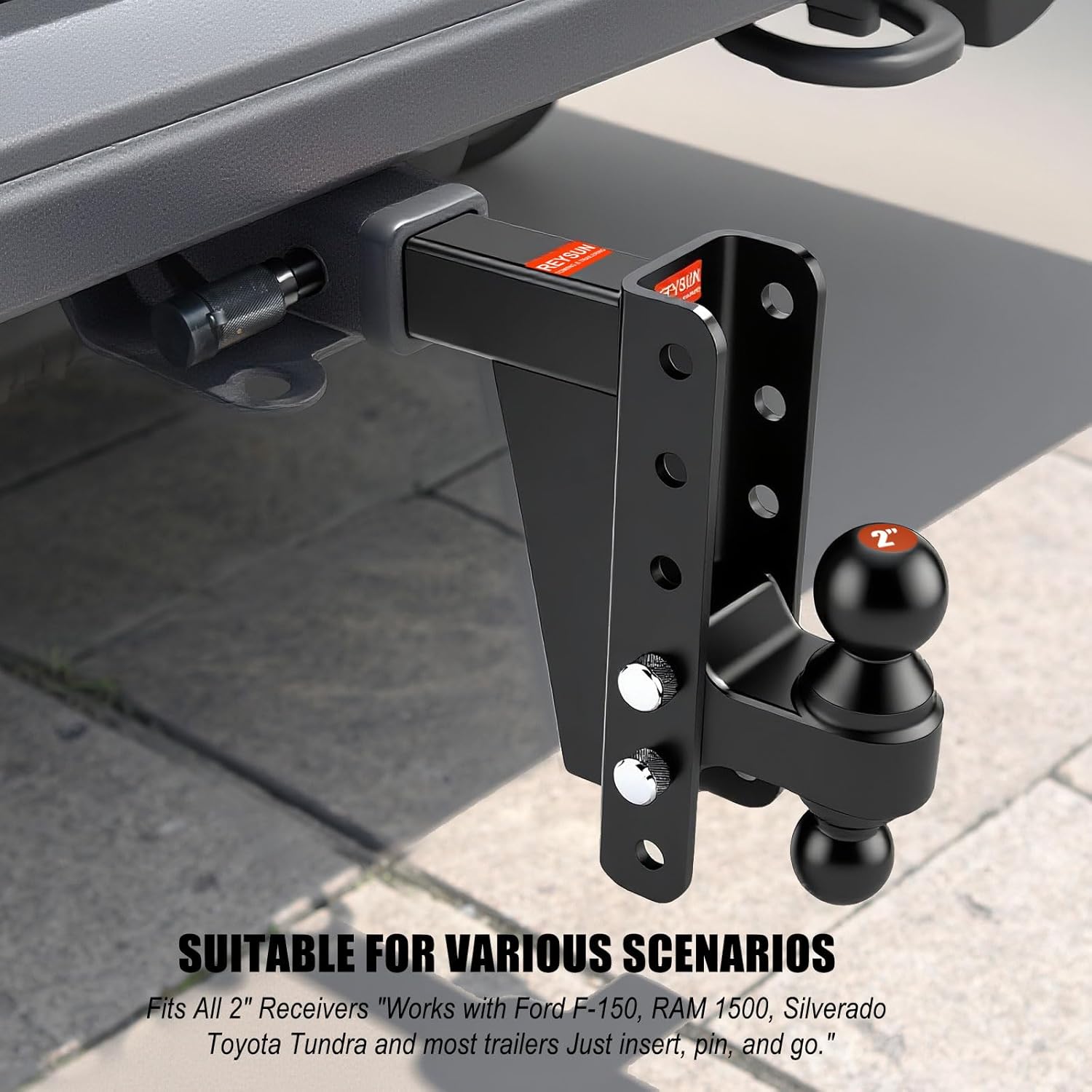 REYSUN specializes in the design and production of trailer accessories including trailer ball mounts, pintle hooks, hitch extenders, rv bumper hitches, hitch adapters, and other hitch accessories. We have a team of professional and experienced technical personnel who can provide customers with high-quality and innovative products. REYSUN adjustable trailer hitch ball mounts assembled with dual ball attachment is highly versatile. The channel style shank also features multiple mounting holes for varying ball heights. You can adjust the hitch ball heights up to 8-1/2 inch drop or rise. The adjustable channel shank is also designed with 2 pin holes and are able to have 2 active length to avoid any interfere with the vehicle bumper. It is 11-5/8" and 13-1/8" length from the center of the hitch ball to the center of the pin hole. This adjustable drop hitch comes with a dual ball attachment. The 2-inch trailer ball is rated for capacity of 10,000 lbs., and the 2-5/16-inch trailer ball for 14,000 lbs. Package also come with 2 pieces of heavy duty hitch pin and 1 piece of trailer hitch lock