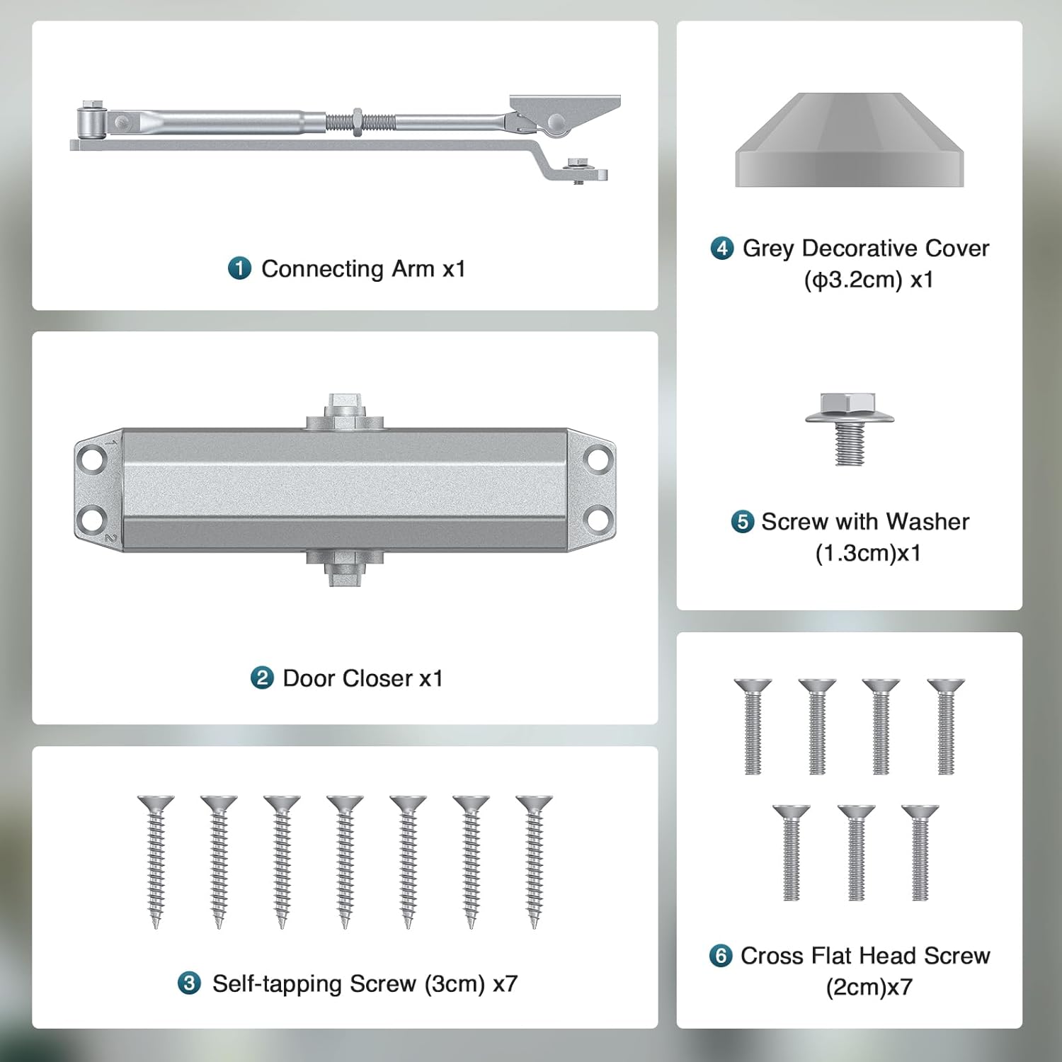 | Included Components | Door Closer Body, Instruction Paper, Parallel Arm Bracket, Screws And Fastners |