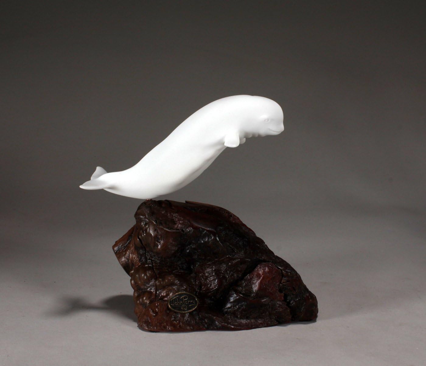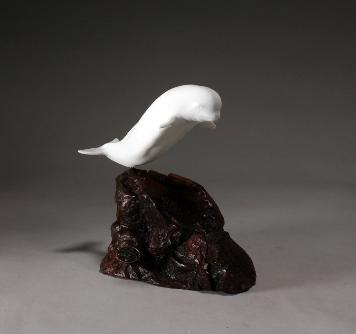 The Beluga is sometimes called the canary of the sea because of its distinctive chirping vocalizations. It is molded in our proprietary resin compound called Pellucida that resembles Bisque porcelain but is more durable. Mounted on its polished burlwood base it stands about 6 inches tall and the base is about 7 inches long. The beluga itself is about 6 inches long. PLEASE NOTE: these photos are of illustrative samples only. Each burl is a piece of nature's art, so the one you will receive will be different, but of similar size and comparable beauty. It is SIGNED and comes with a CERTIFICATE OF AUTHENTICITY.