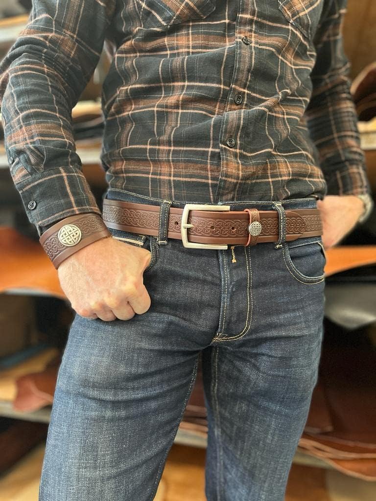 Celtic eternity symbol embossed on a stylish men's leather dress belt. Handmade in Ireland using vegetable tanned Italian leather for a genuine unique look that only gets better with wear and age. Wear with jeans or dress up any outfit. Fine artisan craftmanship makes this a great gift idea.