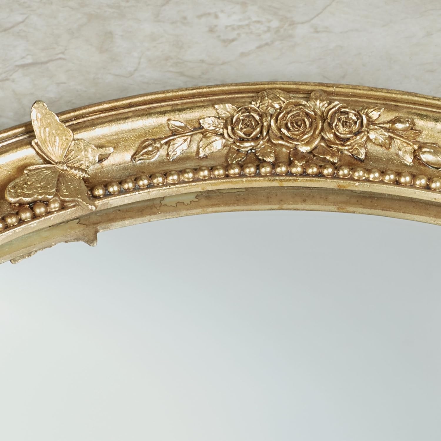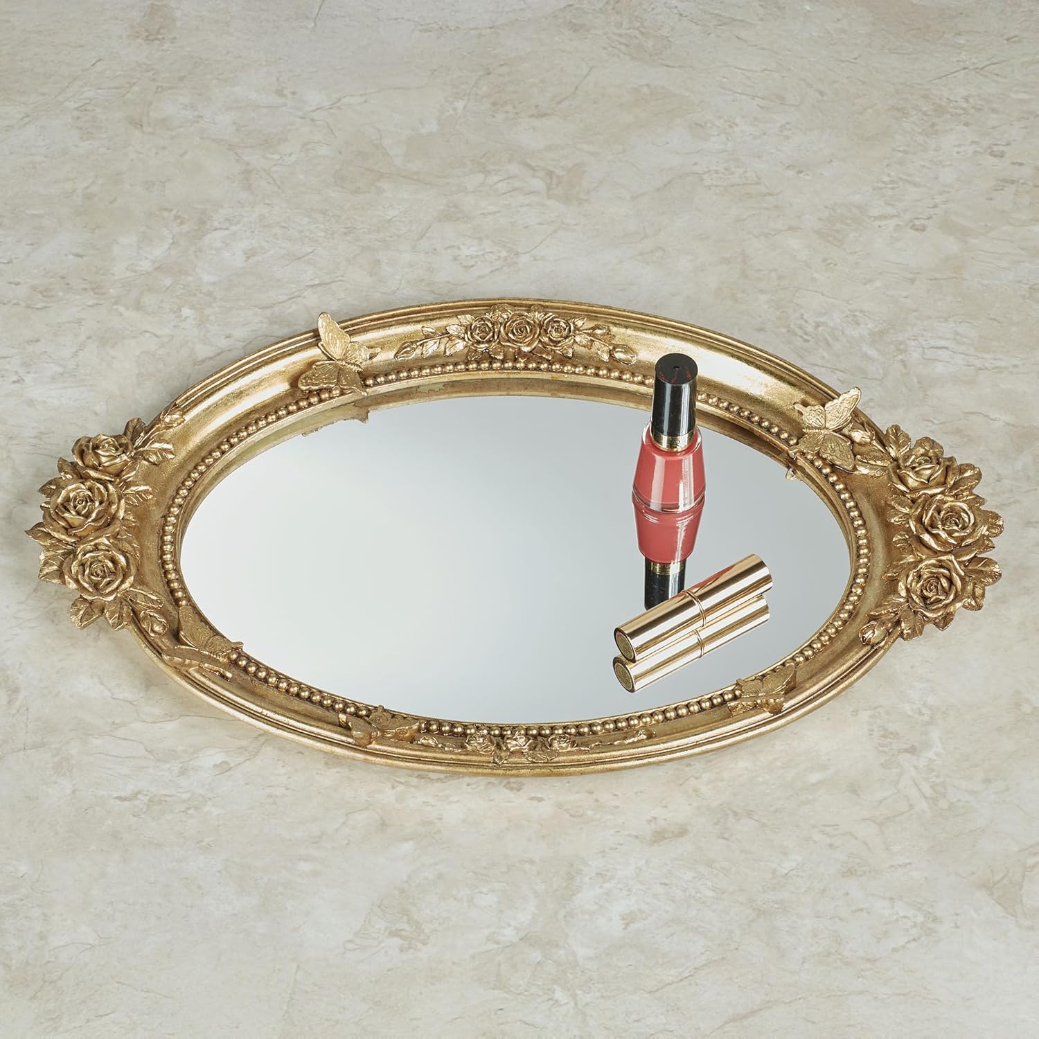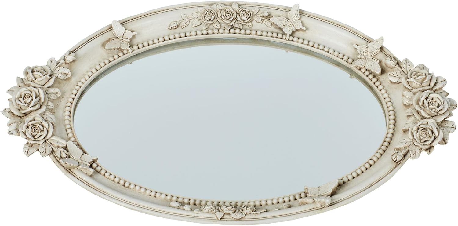 The elegant Butterfly in Roses Venetian Gold Vanity Tray is a reminder of sweet summer days. With a mirrored glass bottom, the resin oval frame is handpainted and features dimensional butterfly, rose, and bead designs. Ideal for displaying perfumes, makeup or jewelry in the bathroom or on a vanity dresser. Mirrored vanity tray measures 17.5 inches wide x 11 inches deep x 1 inch high.