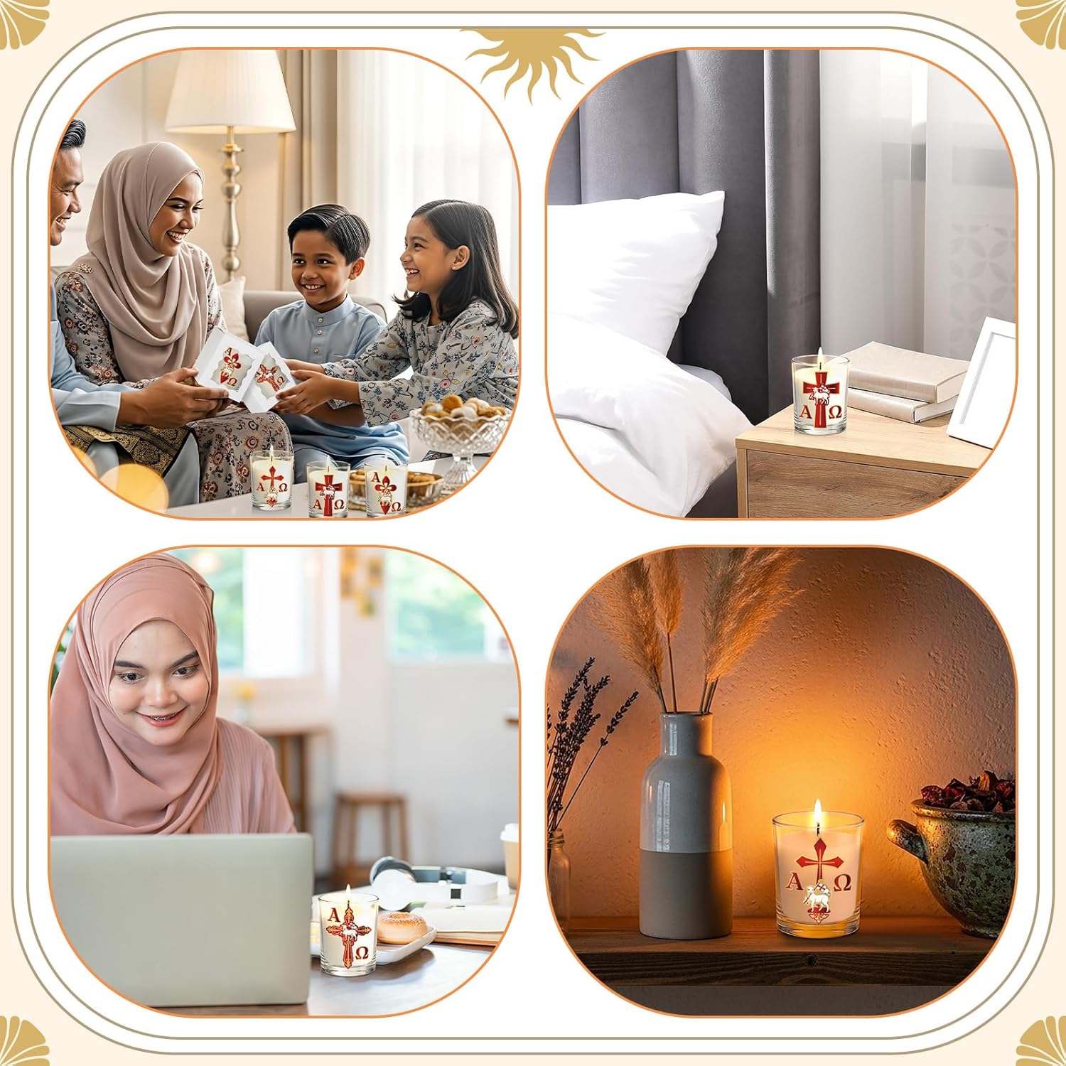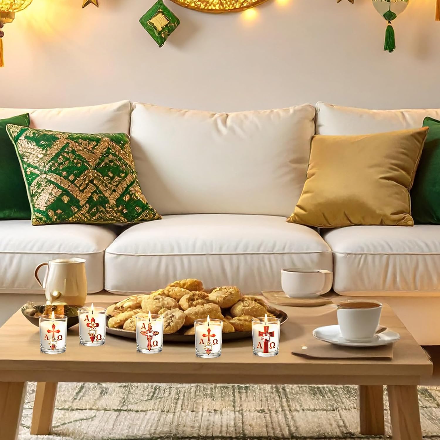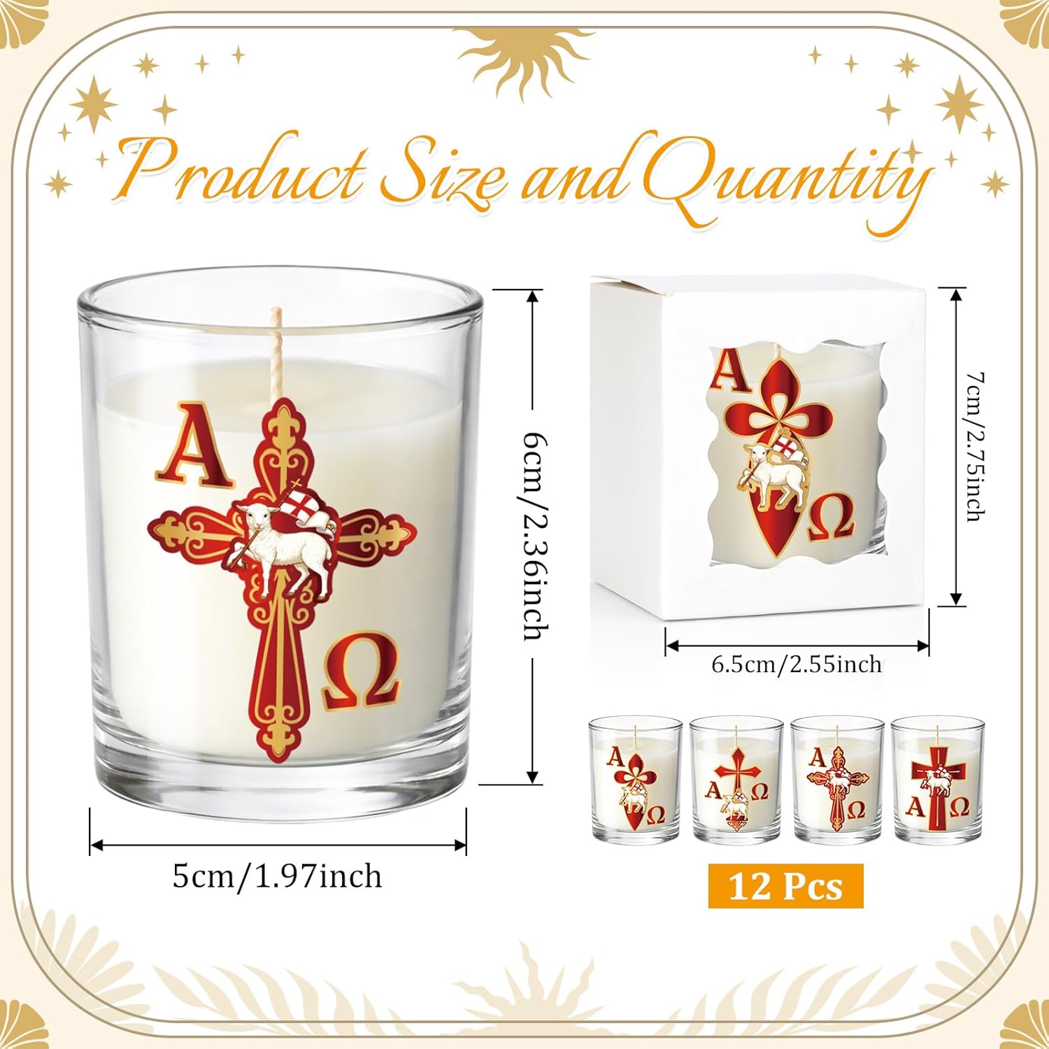 Features Christian Religious Paschal Candle This 12-piece Christian scented candle gift set features beautiful religious designs including the Alpha Omega symbol, cross, and lamb (sheep) imagery representing the Lamb of God. Inspired by traditional Paschal candles used in Catholic Easter celebrations. Catholic Prayer & Church Decor These candles can be used as religious vigil candles, church decorations, prayer candles, or spiritual home decor. They are ideal for Easter, First Communion, Christ Baptism ceremonies, confirmation events, and Catholic prayer services. Cirio Pascual Catolico Tradition The Paschal candle, known in Spanish as Cirio Pascual Catolico, symbolizes Christ as the light of the world and is widely used in Catholic Easter celebrations, baptism ceremonies, and church worship traditions.