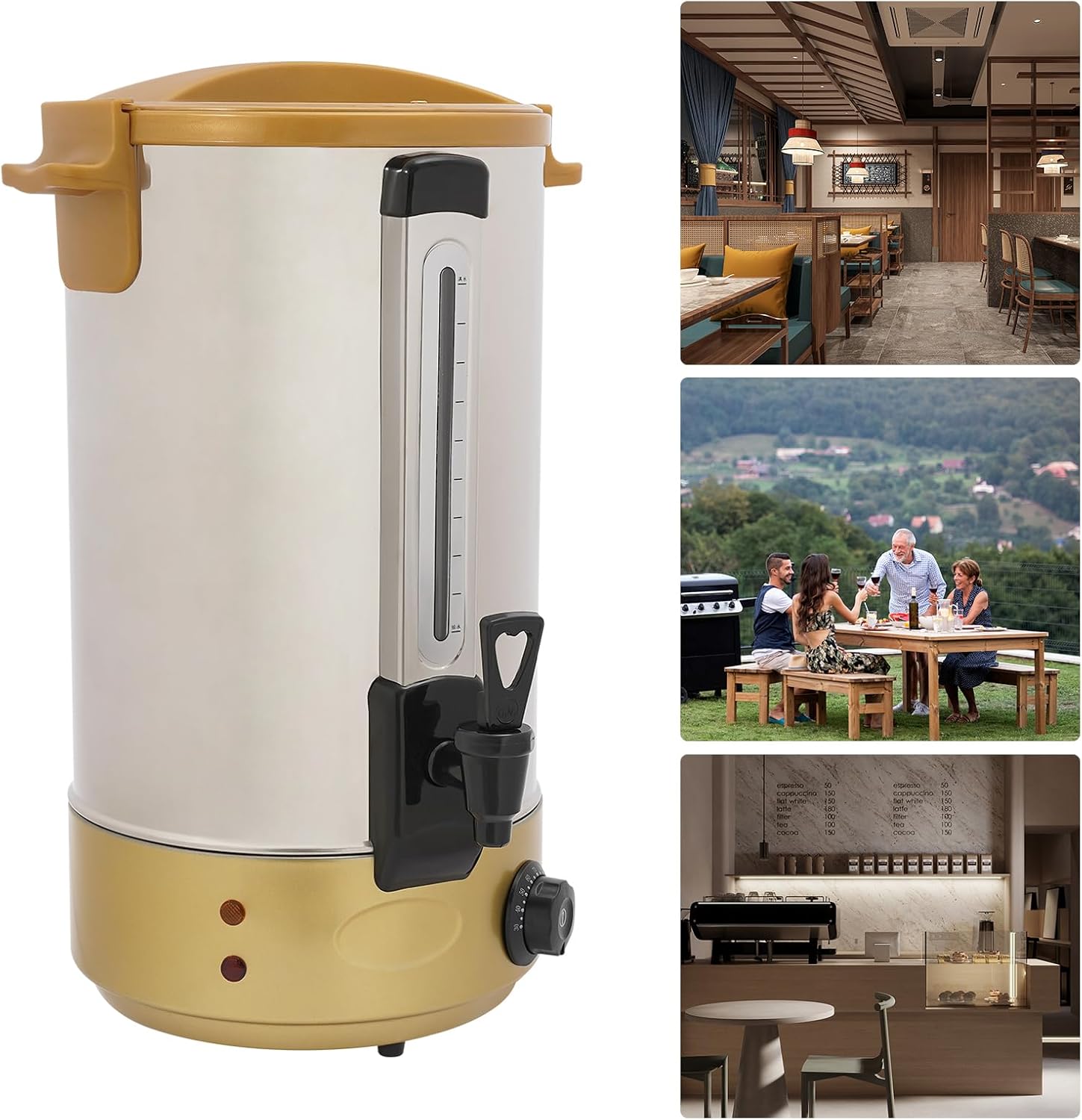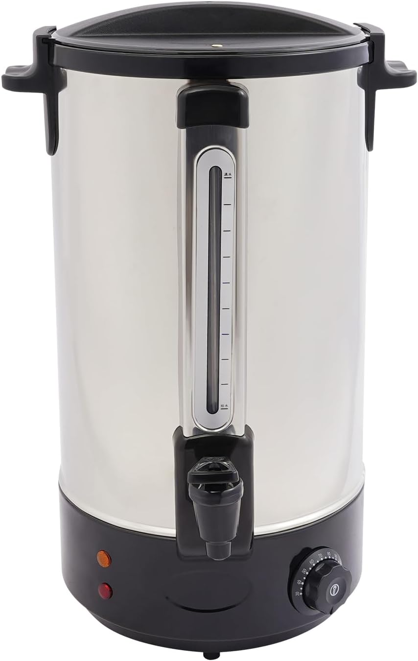 DescriptionThis hot coffee dispenser is made of high-class stainless steel and has the dual function of heating and keeping warm. The coffee pot has high heating efficiency and you can easily adjust the temperature as needed. The large capacity design can meet the needs of multiple users. The simple construction and smooth surface make the coffee maker machines effortless to clean. If you often need to make coffee or tea, please take a look at our hot coffee maker, which will be the ideal choice for you.SpecificationsStyle: ModernColor: Black Material: 201 Stainless Steel, 304 Stainless Steel, Copper, Resin Shape: Round Assembly Required: No Mount Type: TabletopNumber of Faucets: 1Plug Type: US StandardPower Source: Corded ElectricRated Voltage: 110VRated Power: 1800WAdjustable Temperature Range: 30°C-120°C/86°F-248°F Capacity1: 18L/4.76galActual Capacity: 13L/3.43gal Product External Size(D*H): 27*46.5cm/10.63*18.31in Product Internal Size(D*H): 24*29cm/9.45*11.42in Package Size: 32*31*50.5cm/12.6*12.2*19.88inGross Weight: 18.5kg/40.79 lbsNet Weight: 17.58kg/38.76 lbsCapacity2: 28L/7.4galActual Capacity: 16.5L/4.35gal Product External Size(D*H): 27*54cm/10.63*21.26in Product Internal Size(D*H): 24*36.5cm/9.45*14.37in Package Size: 32*31*57.5cm/12.6*12.2*22.64inGross Weight: 20.8kg/45.86 lbsNet Weight: 19.76kg/43.56 lbsPackage Included1* Hot Coffee DispenserNotesPlease allow the slight color difference caused by the shooting light and 1-3cm error due to manual measurement, and make sure you do not mind before you order.