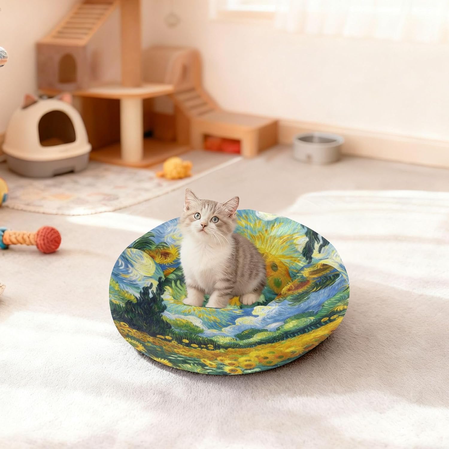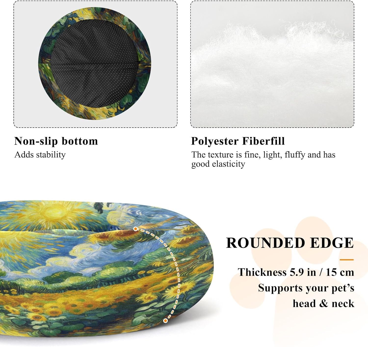 Product DescriptionMaterial Composition: Cotton Filling + Non-slip BaseSizes: XS/S/MSuitable For: Puppies, Small Dogs, Medium DogsFeatures- Soft plush fabric with a smooth, delicate texture provides pets with warm, comfortable tactile sensations- Round shape caters to pets' natural tendency to curl up, offering a sense of security- Slightly raised edges form a soft cushion for pets to lean against, preventing rolling off during sleep- Removable design allows for easy washing by pet owners