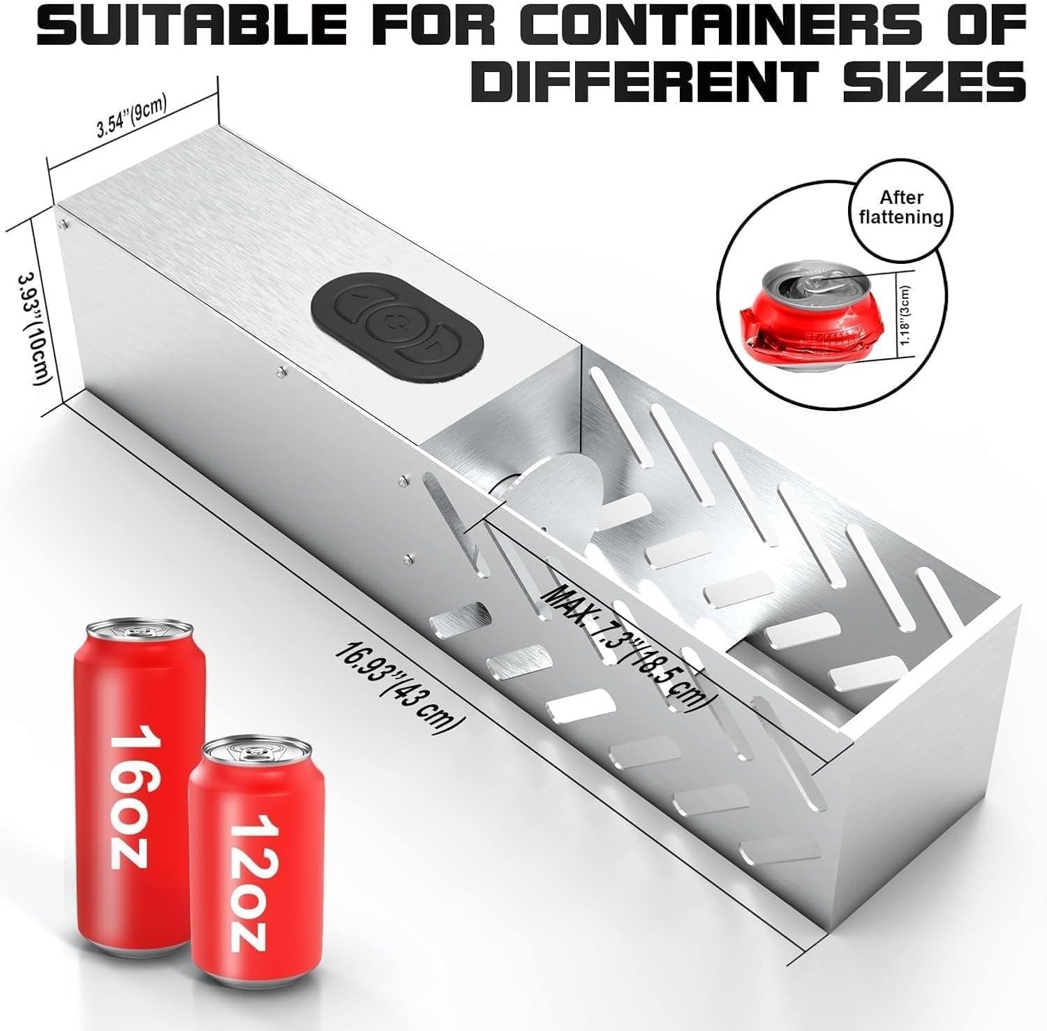 ELECTRIC CAN CRUSHERElectric Can Crusher for Recycling 12oz~16oz Cans, Automatic can crushers, wall mounted Can smasher for recycling Aluminum Seltzer, Soda, Cola, Beer CansThe excellent recycling tool, the aluminum electric can crusher, can easily compress the size of the cans, saving space in trash cans and recycling boxes, making it easier for sanitation workers to recycle.Features:1. Since it is an electric compressor, there is no need to connect an additional air compressor.2. Safe and reliable This electric can crusher will not work too fast.3. Can compress ordinary aluminum cans and water bottles to save storage space.4. Recycle aluminum cans to protect the environment and resources.5. Suitable for homes, bars, restaurants, schools and other places.Specification:Product name: Electric cannerProduct size: about 43.5*9*9 cm/17.13*3.54*3.54 inchesVoltage: 100V-240Vpacking list:Electric can opener*1notebook:1. Due to different monitors and lighting effects, the actual color of the item may be slightly different from the color in the photo.2. Manual measurement, please allow slight measurement errors.