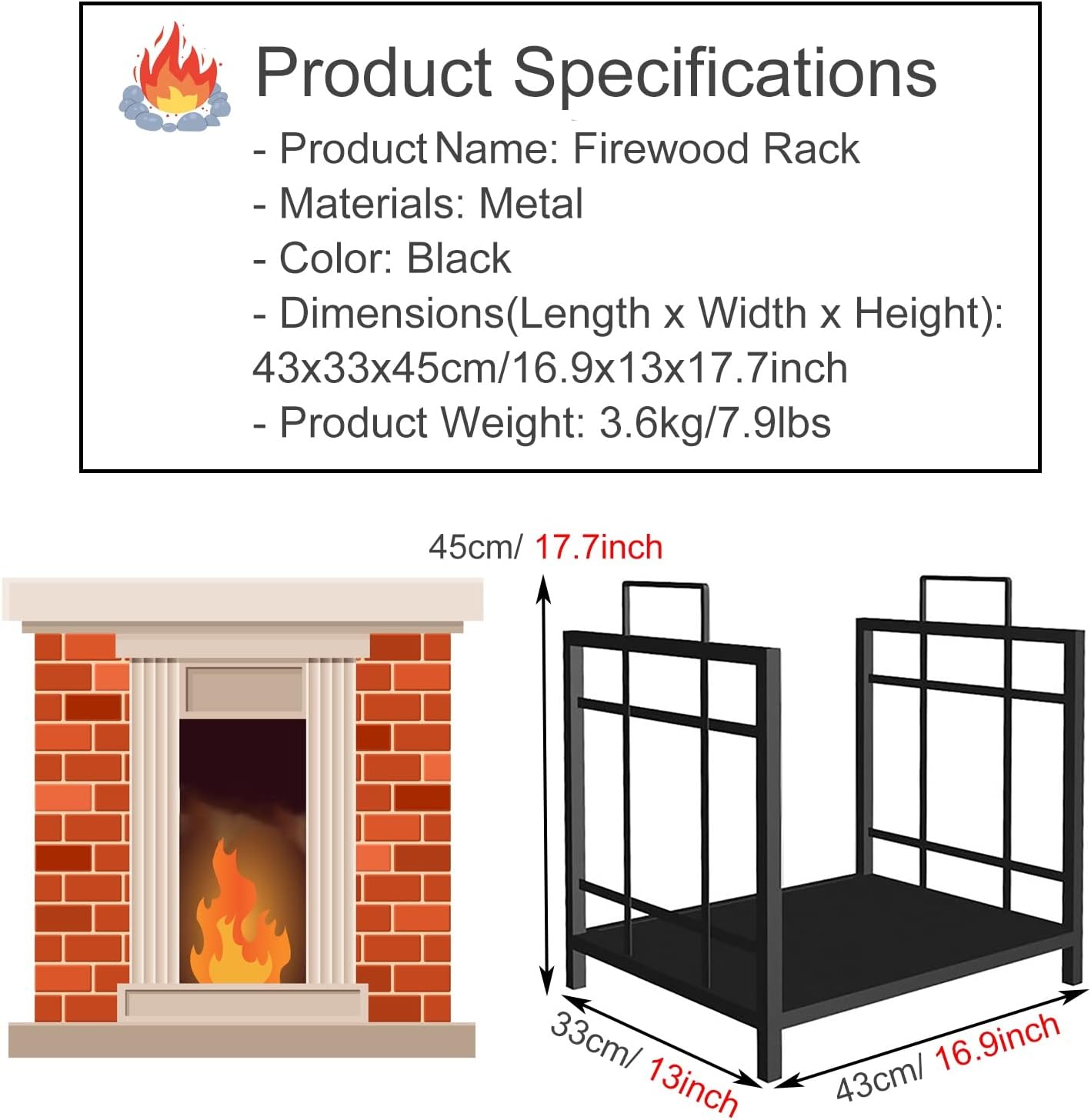 You can put the log rack frame in any hot, cold, warm or dry climates and hold enough wood for fireplace all seasons.The sturdy rack can be load-bearing enough weight without getting the support rod bent after wood-stacking. Specification: - Materials: Metal - Color: Black - Dimensions(Length x Width x Height): 43x33x45cm16.9x13x17.7inch - Product Weight: 3.6kg7.9lbs Features: - Due to dry firewood burns better, the wood holders firewood outdoors keeps logs off of the ground. - Place it next to your fireplace, the clean lines will add a touch of elegance to your room. - It's your best choice while enjoy a cosy evening chatting by the fireplace or BBQ in the yard with your family and friends. - outdoor porch, backyard deck, outside fire pits, under eaves, on patios, or put it on a hard surface, such as paving stones, concrete patio or gravel. Package List: - 1 × Firewood Racks Note: - There may be an error of 1-2 cm due to manual measurement. - There may be chromatic aberration due to the difference between the recording lamp and the display. Please refer to the actual product.
