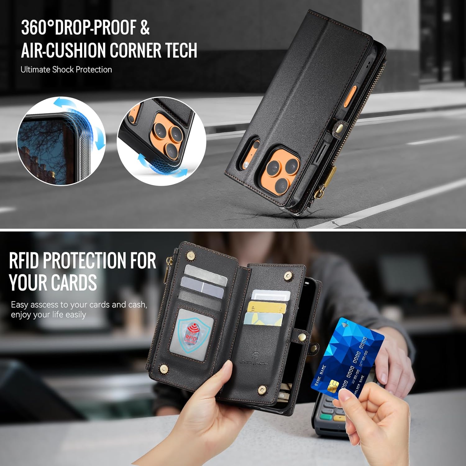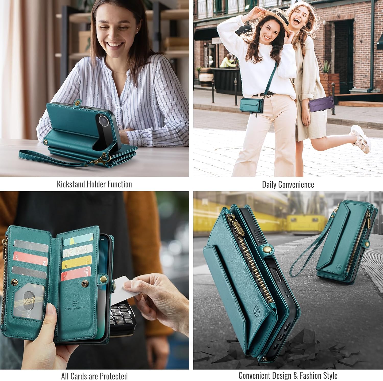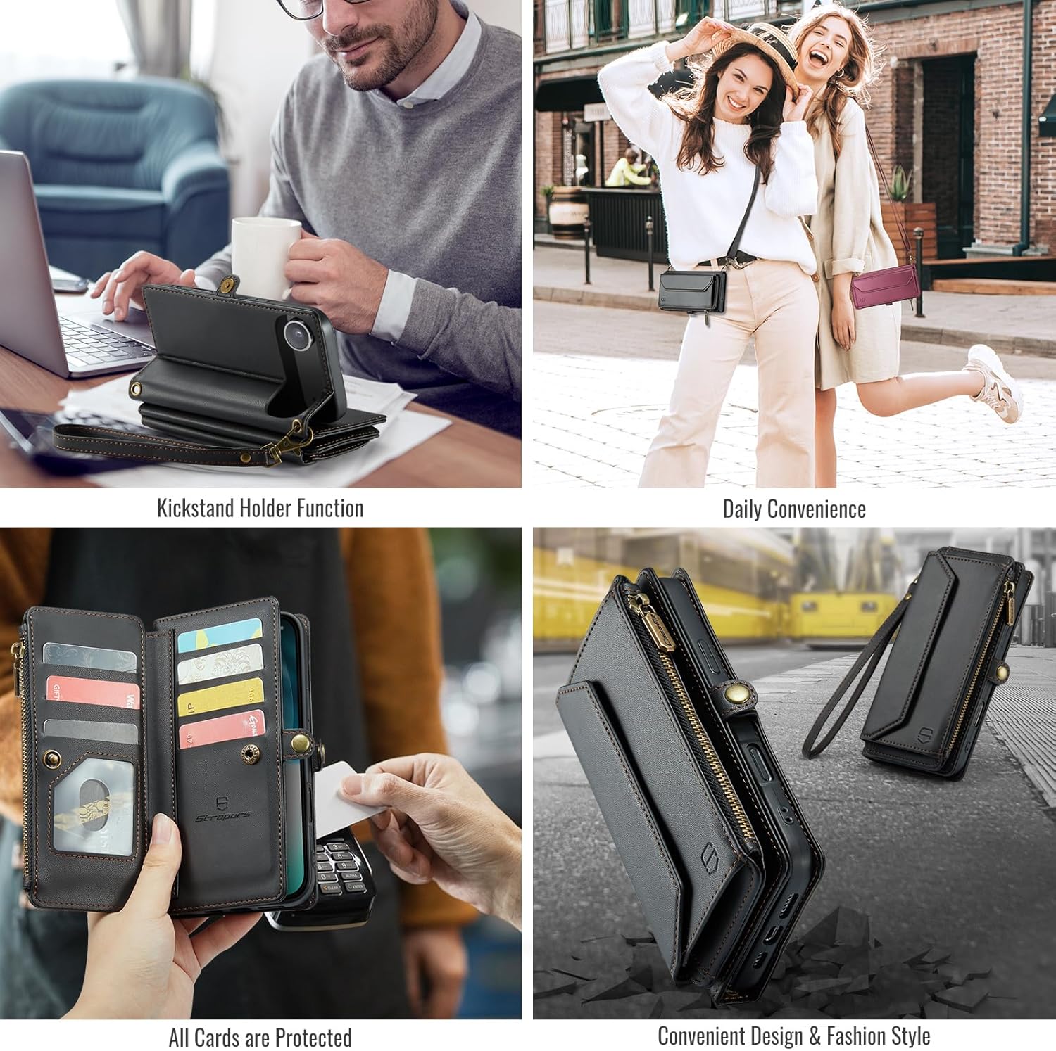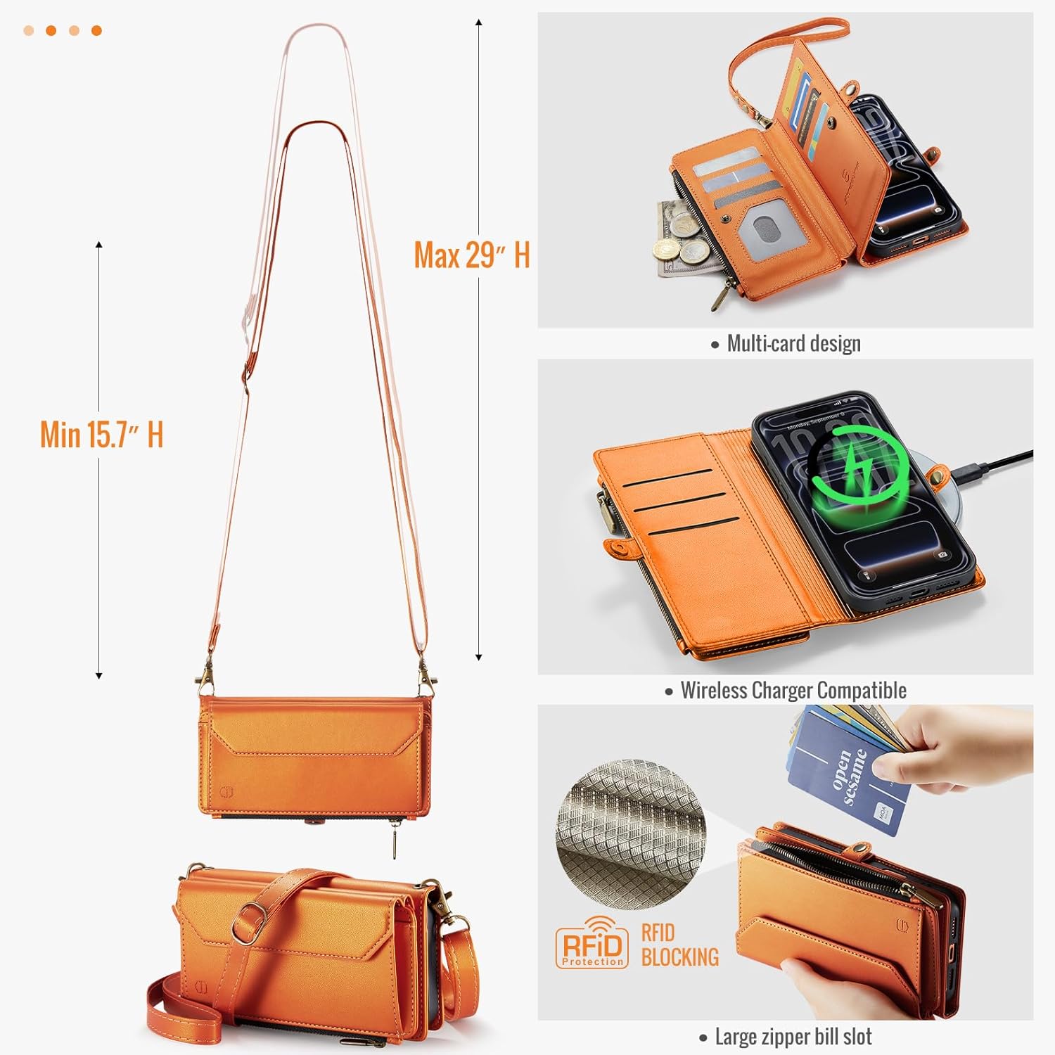 | Additional Features | 1 Magnetic Flap Pouch, 1 Zipper Pocket, 1 Cash Pocket, 2 in 1 Magnetic Detachable, 9 Card Slots With RFID Blocking, Compatible with MagSafe, Crossbody Lanyard & Wrist Strap |