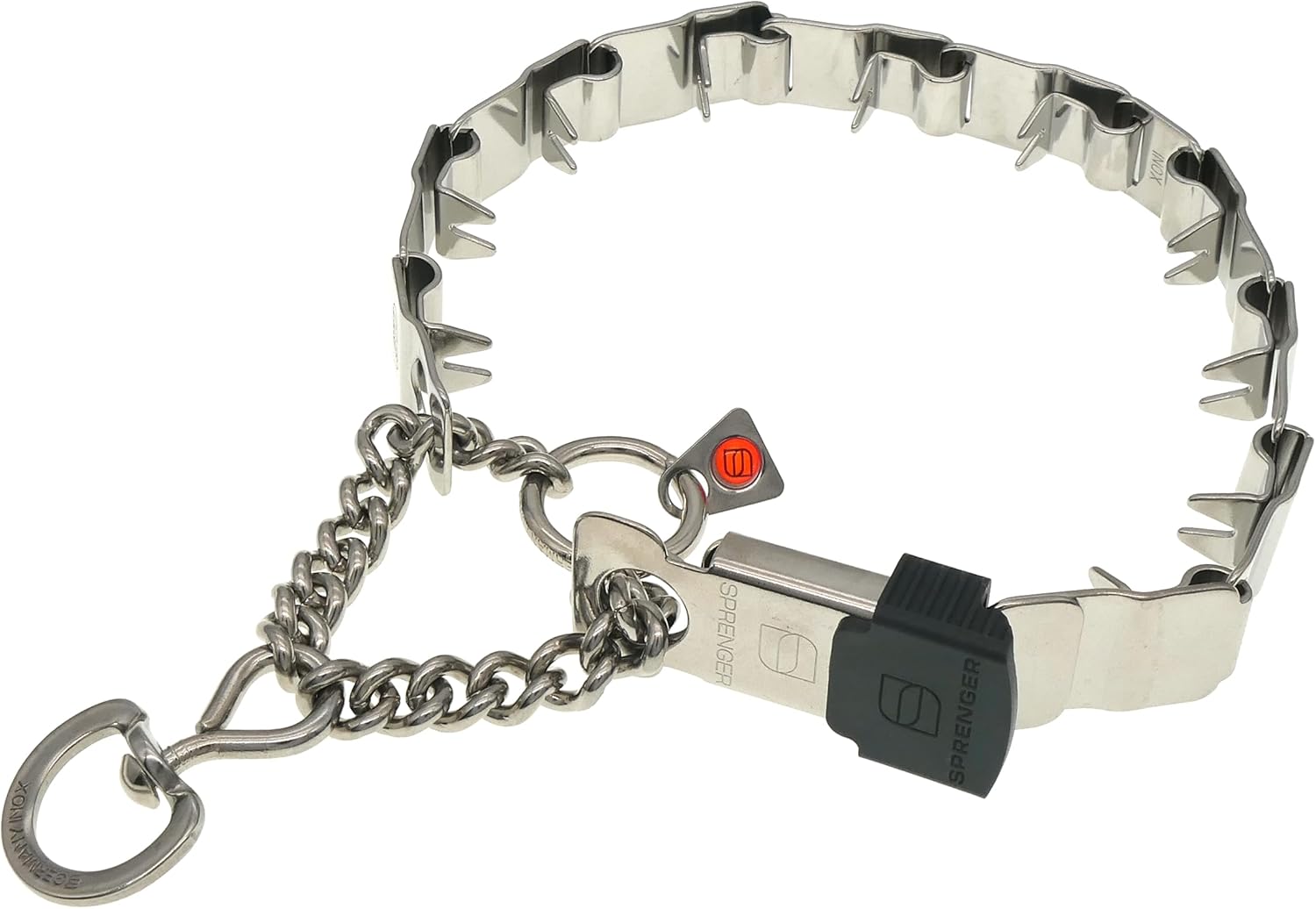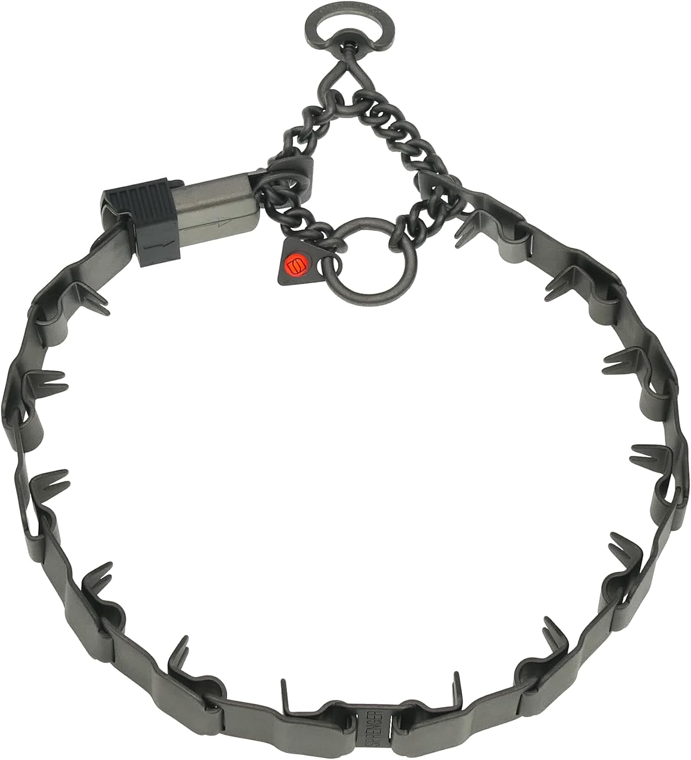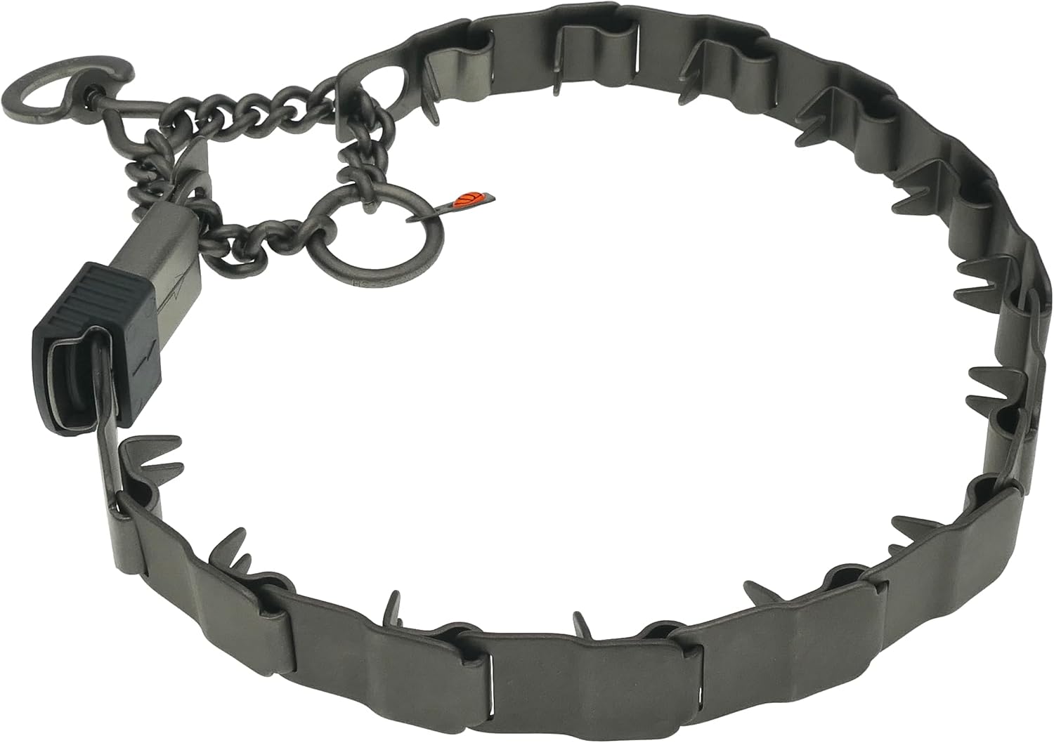 Size:Herm. Sprenger Neck Tech Sport dog collar available in two sizes: · 19in (neck size up to 16in)· 23in (neck size up to 20in)To shorten the collar length, remove links, or use additional individual links to enlarge. Additional links must be purchased separately.Material: Choose a collar made from either rust resistant Polished Stainless Steel or rust resistant Black Matte Stainless Steel.The Collar Features:· Flat links with prongs;· ClicLock buckle for easy application;· Swivel D-ring for leash connection;· Assembly chain.Design:Unlike conventional prong collars, uniquely designed NeckTech Sport collar features short prongs of the links and flat outer surface, offering comfortable wear and stylish look. Fasten the ClicLock buckle to ensure safety of the enclosure and to prevent unintentional opening.Important Note: The plastic jacket is designed to slide out completely from an open buckle; If the jacket was lost, the function of the buckle mechanism will not be affected.