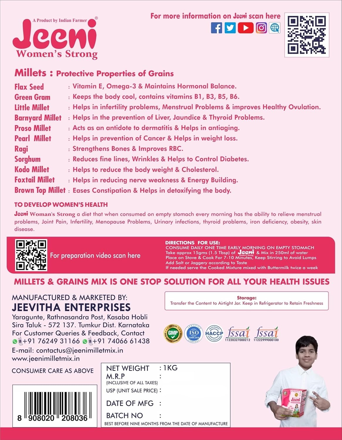 JEENI millet mix was manufactured by understanding the concern of all family's health and importance of time in today's hectic lifestyle. Hence we have choosen the best of ingredients for traditional health mix, roasted it ground and also packed hygienically for you. We believe in making 100% natural and 0% additive free product. This breakfast porridge is full of whole grains like Ragi, Brown top millet, kodo millet, little millet, Barnyard millet, perl millet, foxtail millet, proso millet, jower, green gram, urad Dal, soya bean, horse gram, ground nut, Flax seeds, maize, toot Dal, black pepper, fenugreek, barley, Red rice, Bengal gram, other pulses and grams as well