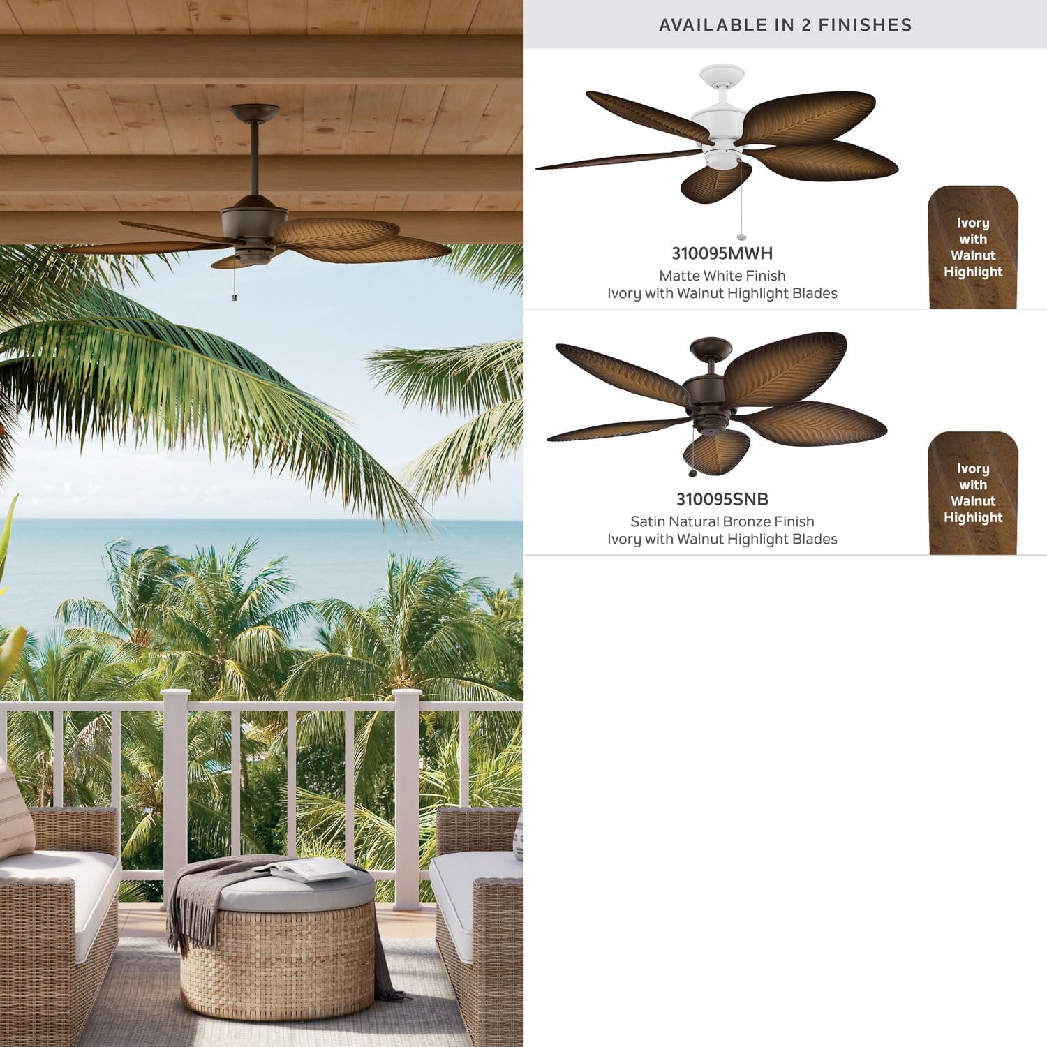 Transform any space into its own paradise with the palm-leaf inspired design of the Nani 5 blade Weather+™ outdoor ceiling fan. This beautiful design makes a great addition to coastal spaces and pairs well with tropical decor. Its broad blade sweep makes it ideal for medium-sized applications while its Weather+ rating allows it to withstand wet-rated weather conditions, plus combat the effect of the environmental elements such as saltwater spray and impact from UV rays.