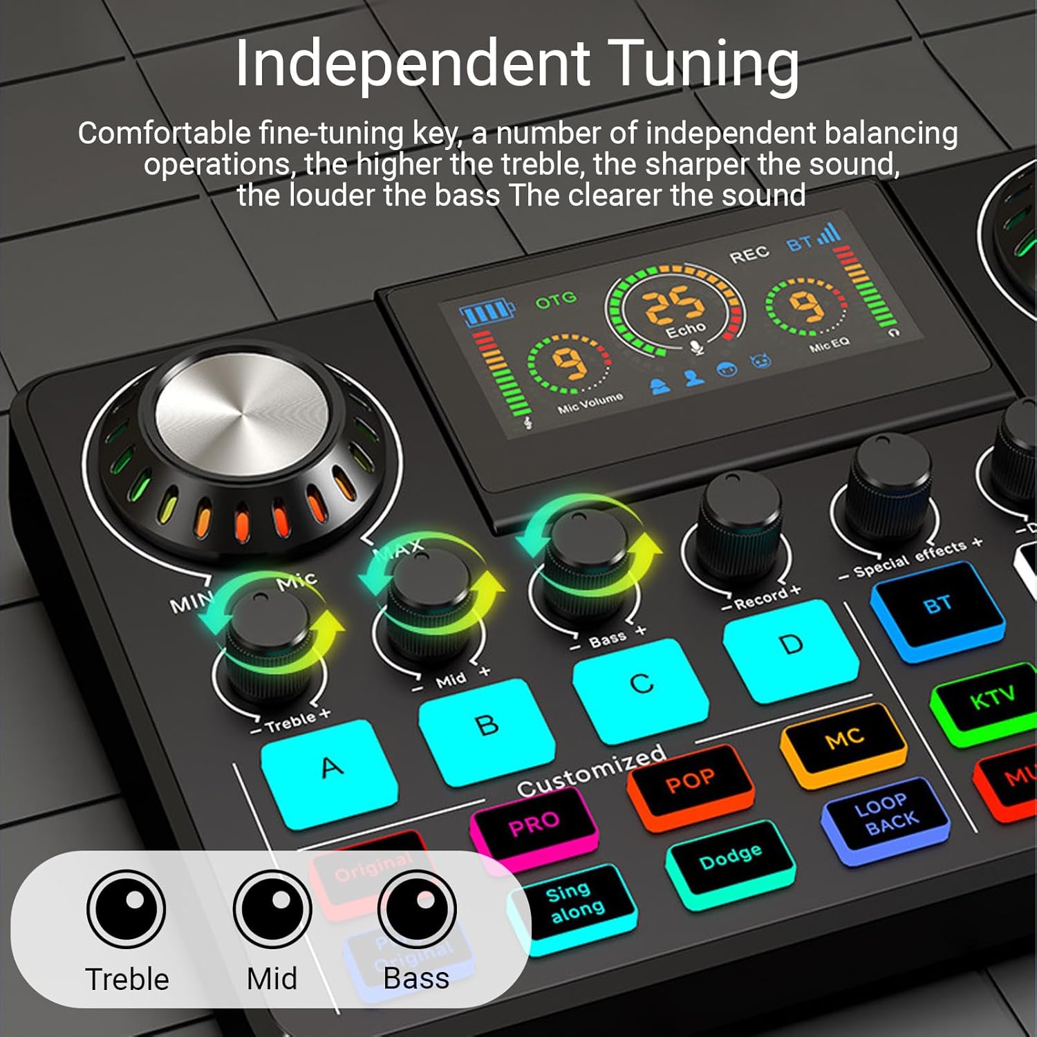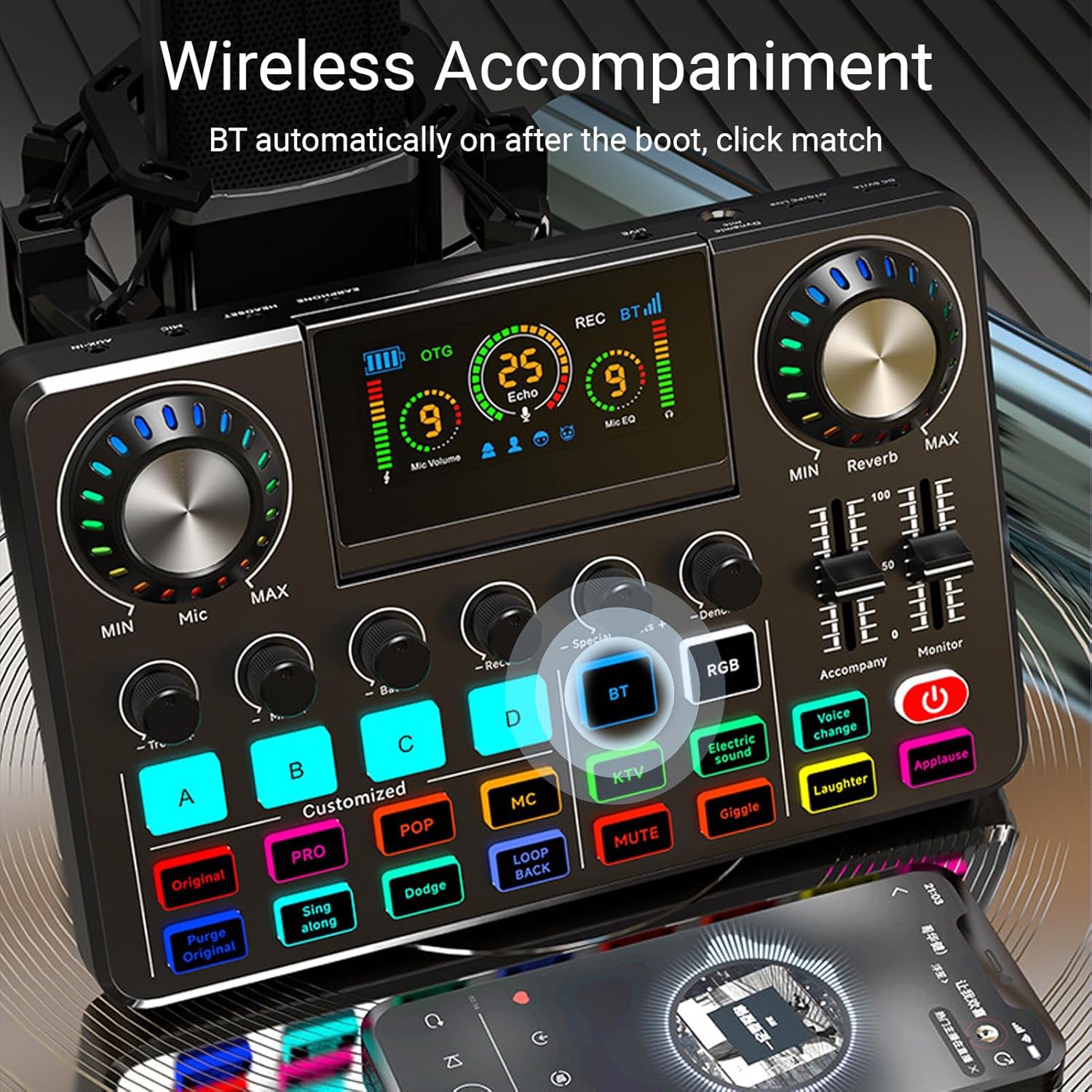 Spec: Sound Adjustment: High/medium/low frequency adjustment; Accompaniment, reverb, monitoring, special effects, recording adjustment; Microphone volume adjustment; Noise reduction gear adjustment; Function Keys: 8 keys Sound Effect Button: 7 keys Special Effects Button: 7 keys Analog Audio Output: LT/RT, stereo Dynamic Range 1kHz: ≥ 105dB Crosstalk: ≥- 106dB Signal to Noise Ratio: ≥ 85dB Output Level (Vrms): Vrms (1.0~2.0V 10kR) Earphone Output Power: 20mW Frequency Response: 20Hz-20KHz Output Sampling Rate: 44.1KHz Sampling Bit: 16 bits Charging Interface: Type-C Charging Power Supply: DC 5V-1A Charging Time: (power off) Approx. 6 hours Battery Type: Rechargeable lithium battery (built-in) Battery Capacity: 3.7V/3600mAh Product Color: Black Product Size: Approx. 23 * 15 * 5.5 cm/9.1 * 5.9 * 2.2 inch Product Weight: Approx. 606 g/21.4 oz Package List: 1 * Sound Card 1 * USB-C Charging Cable 2 * Audio Cable 1 * Instructions