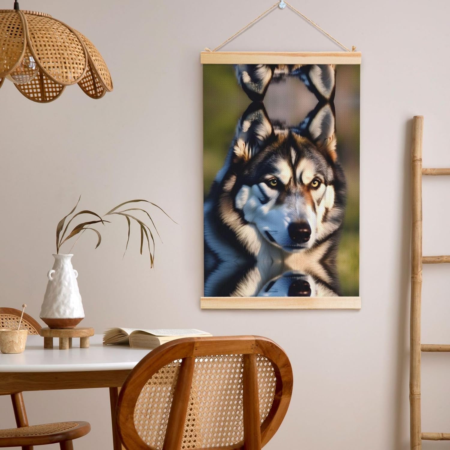 Our Lovely Husky Print Wooden Poster Hanger Is An Excellent Addition To Your Home Decor Or A Perfect Gift For Friends And Family. Made Of Selected Quality Canvas With Brilliant And Enduring Colors, This Wall Art Is Designed To Resist Water, Dust, And Fading, Ensuring The Bright And Vibrant Art Lasts. The Polyester Is Enclosed Between Two Teak Wood Hanger Scrolls With An Attached 35cm Rope For Easy Hanging. Installation Is Made Simple With The Included Two Nails In A Plastic Box. The Modern Minimalist Style Of Our Wall Hanging Complements Any Home Decor, Elevating The Artistic Ambiance And Brightening Up The Room. Experience The Elegant Transformation This Wall Hanging Scroll Painting Brings To Your Spaces Today.
