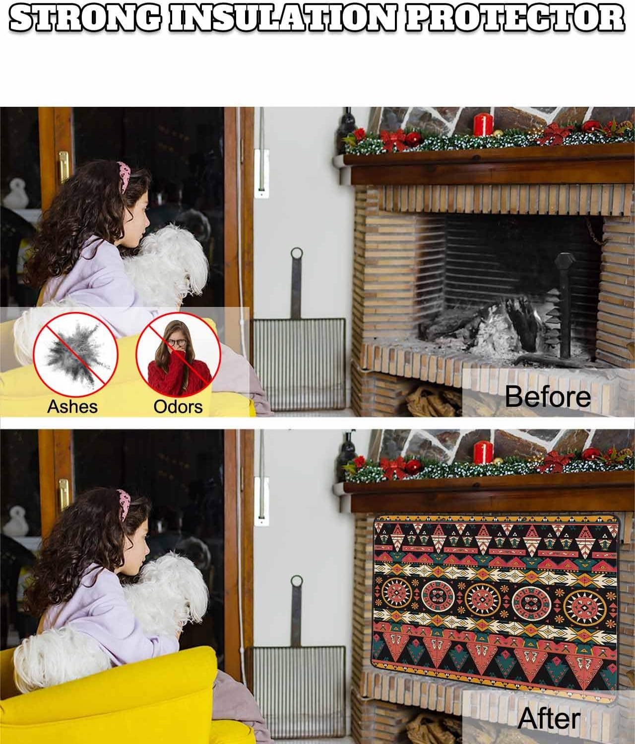 Fireplace cover adds more color to your decorations and brings the joy to your home.Product DescriptionMaterial: Oxford cloth + cotton interlayerSize: 36"x27" / 36"x30" / 39"x32" / 45"x34" / 51"x39"Package: 4 set hooks, a roll of magic tape, 12 magnetsMulti Installation MethodsFireplace cover is easy to install, no wall damage fireplace tools.12 strong magnets or use hook set attach the fireplace blocker tightly, without drilling holes or glue.Fireplace draft cover is a necessary fireplace & stove accessories, attached to fireplace screen easily.Exquisite WorkmanshipThe fireplace screen cover adopts a unique three-layer design, with high-grade Oxford fabric on both sides and filled with high-quality insulation cotton in the middle, which is sturdy and long-lasting.Easy to Install & StorageOur fireplace blocker blanket is easy to install without any tools, it can be easily removed and folded for storage when you need to use the fireplace, without taking up a lot of space.Practical & DecorativeThe fireplace cover not only block draft, insects, ashes and odor, but also decor the inside fireplace with hiding messy fireplace behind it. Safe for children or pets to play in front of the fireplace.Warm TipsPlease measure the size of your fireplace before purchasing. Please use the fireplace insulation cover only after the fireplace is completely extinguished and cooled.Just need to rinse with water. Hand washing is recommended. Do not use bleach. Low iron if needed.