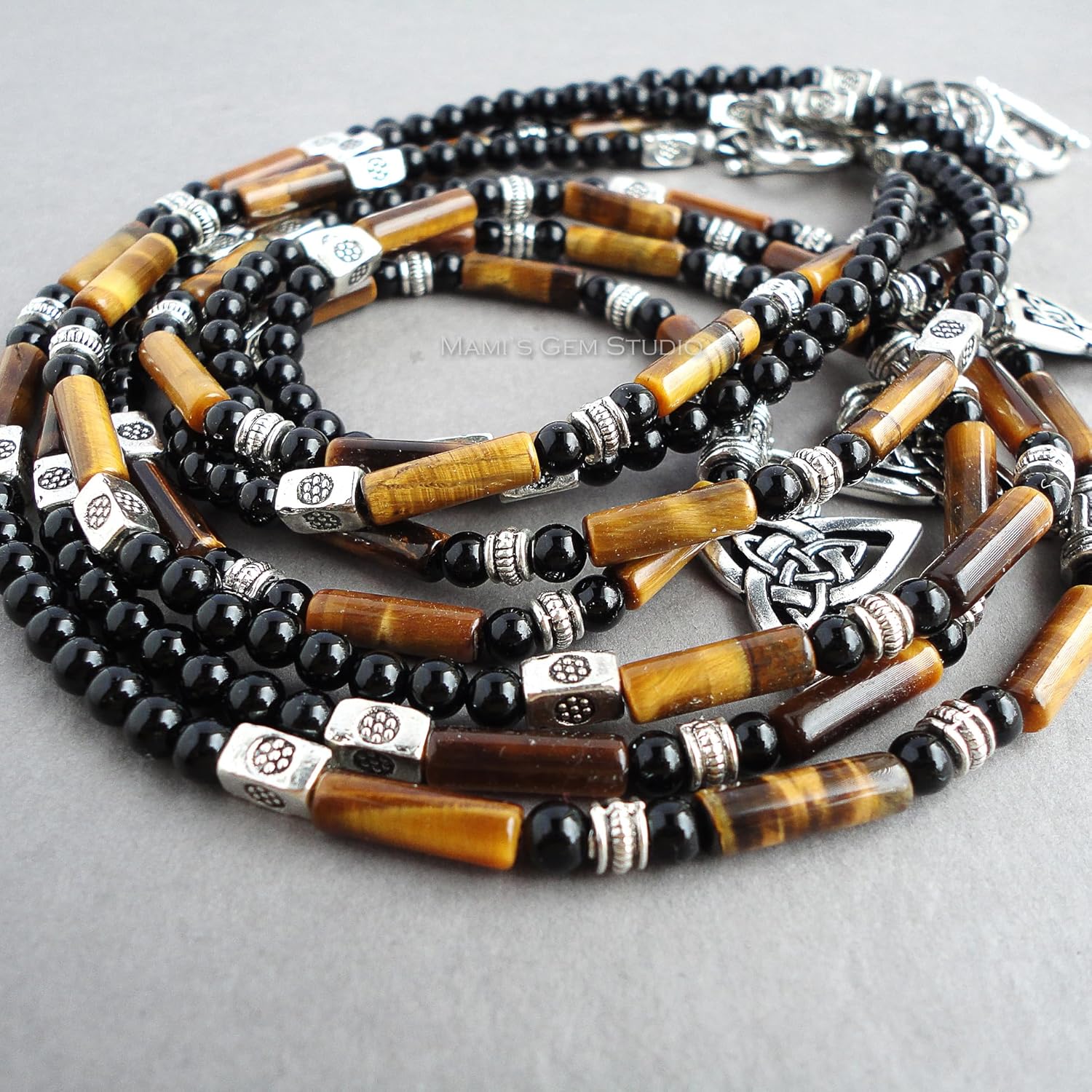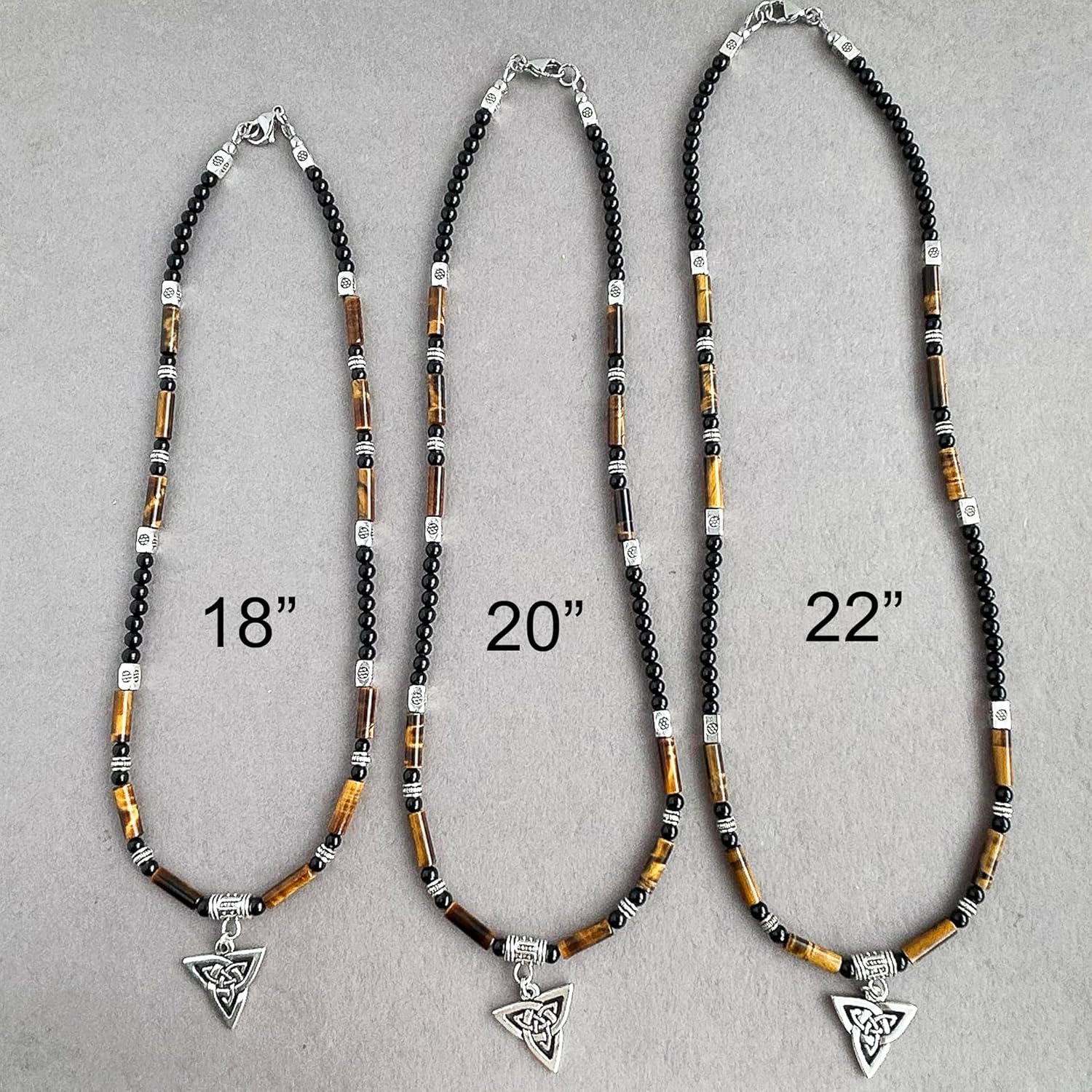 A classy men’s necklace, designed and handcrafted in my studio in Washington, USA. It features a timeless combination of authentic gemstones popular with men of all ages: Tiger Eye, known for its rich golden-brown luster, and Black Onyx for a bold, masculine contrast. The necklace is accented with a Celtic knot double triquetra (triangle) charm pendant, a high-quality, made-in-USA TierraCast piece in antiqued fine silver-plated pewter. Antiqued silver-tone pewter beads add depth and enhance the overall stylish look. Finished with a durable stainless steel lobster clasp. All metal components are lead-safe.