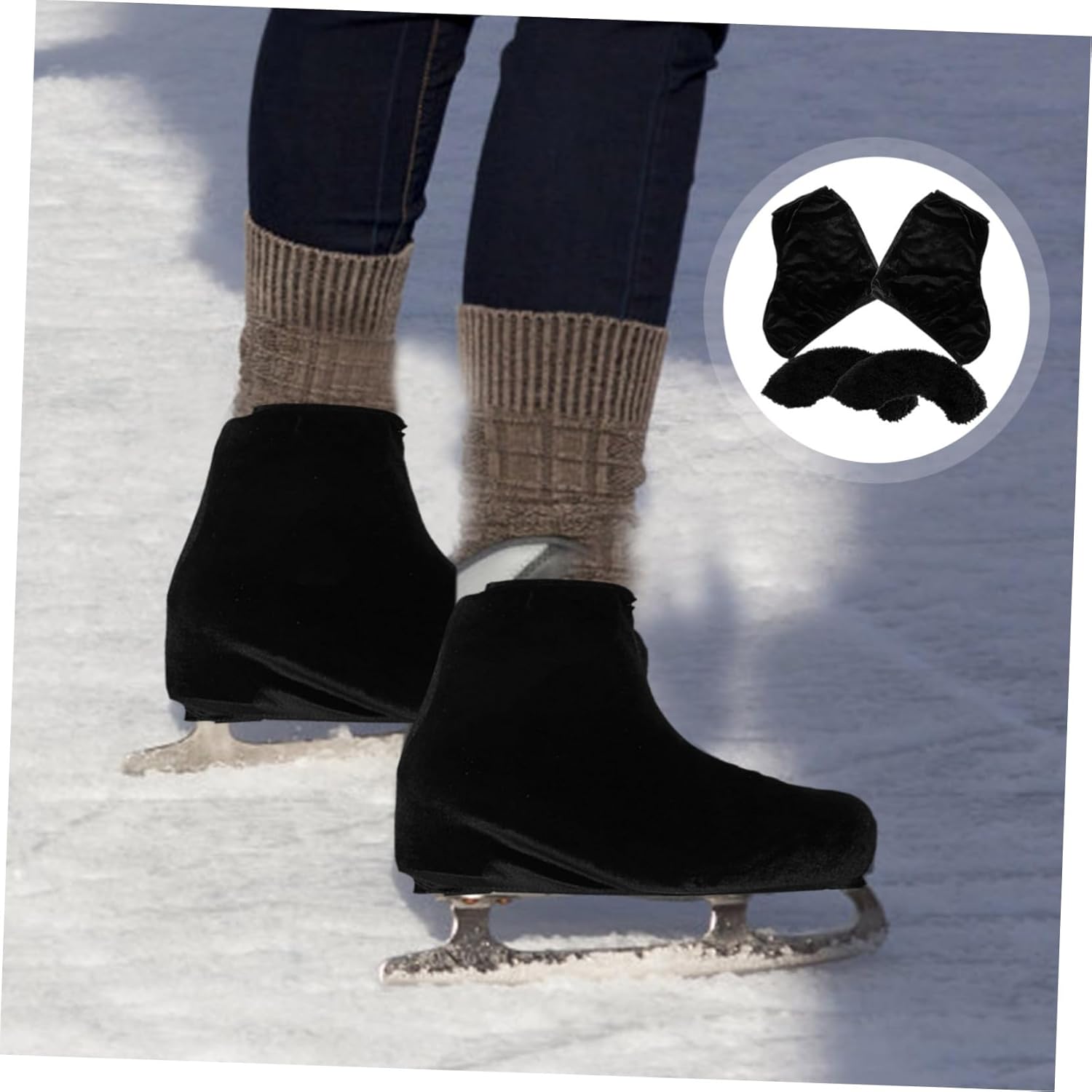 Package Include 4 x Pair of Skate Blades Guards 4 x Pair of Ice Skate Covers Features -Size(ice skate cover):22.00X19.00X0.10cm/8.65X7.47X0.04in shoe cover -Color:Black boot covers -Size(skate blades cover):25.00X7.00X1.00cm/9.82X2.75X0.39in protective skating boot covers -Material:Polyester,Velvet elastic ice skates guards -Made of comfortable and supple polyester material, , and skating boots covers. -The close-fitting design provides extra support for your figure skating boots wear-resistant boot protectors. -Can be the present for your friends who like to skating, and they will like this skating boot covers. -With the fine and great workmanship, it can ensure its durability and practicality snow skating boot cover. -It can cover your skating shoe prevent your skate from dirty. Can be worn with any skating and roller skating outfit or clothing skating boot protector.Goods Informationpolyester skating boot covers Using polyester material keeps the feet warm and protects the skates.skates boot covers Designed with elastic function, the Boot Cover can cover the ice skate boot prevent your boot from wet.polyester boot protectors Suitable for your ice or roller skating performances and classes, and it also can be applied to different kinds of skates, such as hockey skates, figure skates, ice skates and so on