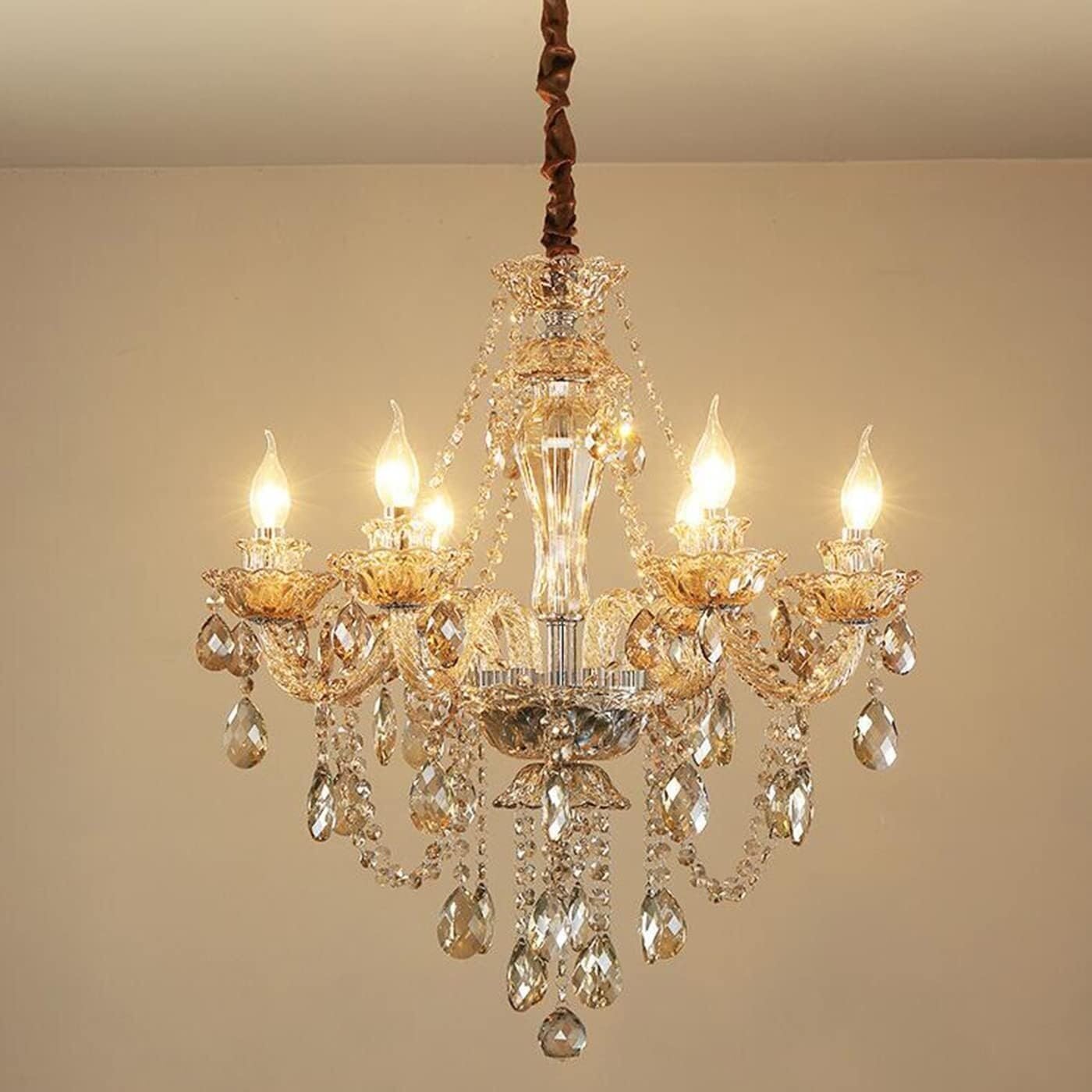 Name:Crystal glass chandelierLamp shape: Suction & hanging chandelierMaterial GlassCrystal+HardwareLight source: E14.Note: Bulbs Not Included.Input Voltage: 220VHanging chain: 30CM Rough hanging chain, strong load bearing.Applicable area: 15-40 square meterspacking list:1x crystal glass chandelier1x manual