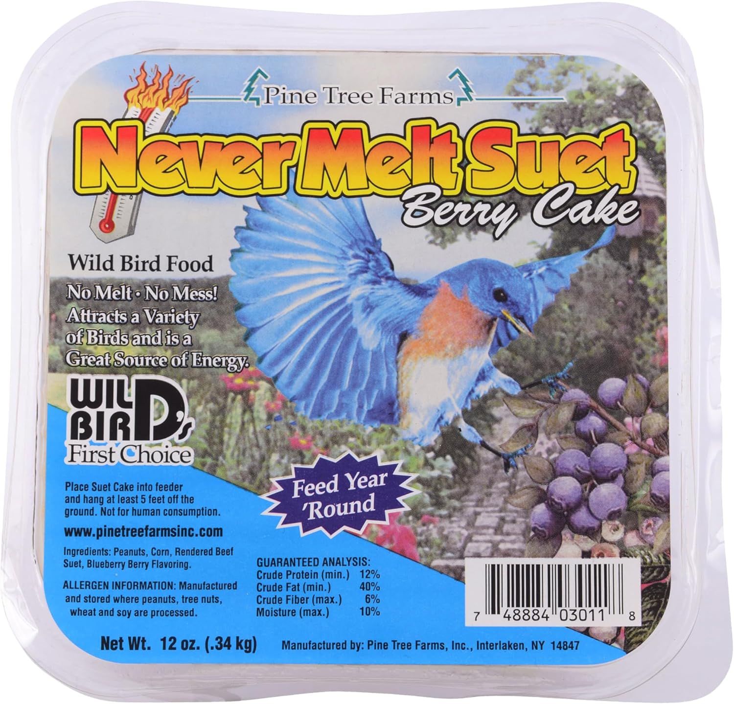 Offer a large amount of delicious and nutritious suet all year using this 24 Pack of Pine Tree Farms Never Melt Berry Suet Cakes. This convenient pack of 24 suet cakes delivers a wealth of nutrients and blueberry flavoring, helping birds thrive all year long. These cakes are specifically designed to withstand temperatures up to 120° Fahrenheit without melting, allowing usage during spring and summer months. Blueberry flavor helps entice birds to the garden for these suet cakes, while the high protein content bolsters their health. Place each cake in a suet or platform feeder to attract fruit and suet eating birds to the garden. Take advantage of this generous package to offer suet cakes at multiple areas of the bird sanctuary at the same time. Made in the USA. Note: This case pack contains 24 Pine Tree Farms Never Melt Berry Suet Cakes. Birds that enjoy this suet: bluebirds, chickadees, crows, flickers, grackles, grosbeaks, jays, kinglets, mockingbirds, nuthatches, orioles, robins, starlings, tanagers, thrushes, towhees, warblers, waxwings, woodpeckers, and wrens Feeder Options: suet feeders, platform feeders, and tray feeders Weight: 12 oz. each Dimensions: 4.5"L x 4.5"W x 1.125"D
