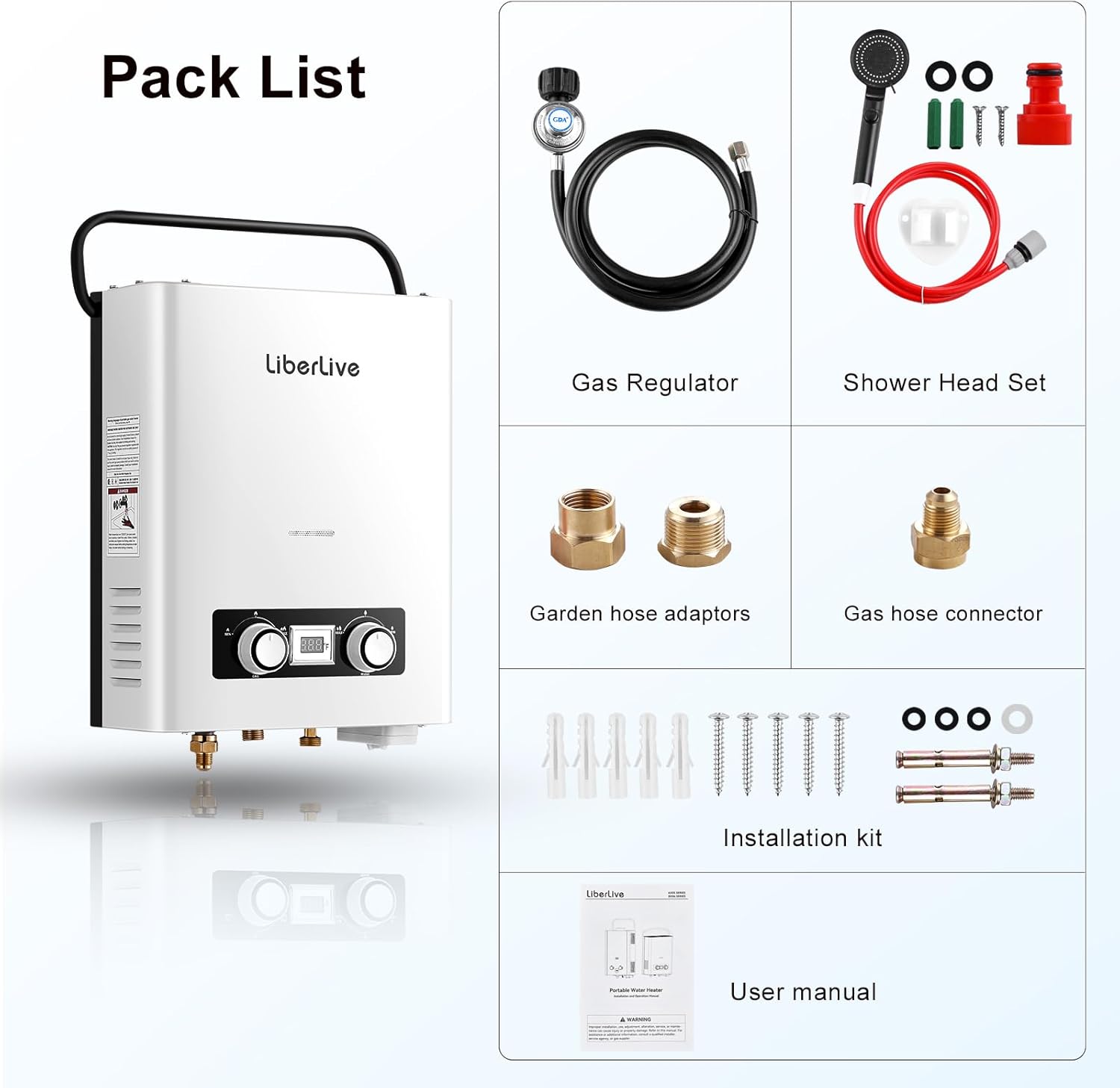 | Included Components | 1 x Portable Tankless Water Heater, 1 x Users Manual, 1× CSA Certified Gas Regulator and Hose,1× 5 Feet On/Off Switch Shower Head,1× Mounting Hardware, 2× Garden Hose Adapter |