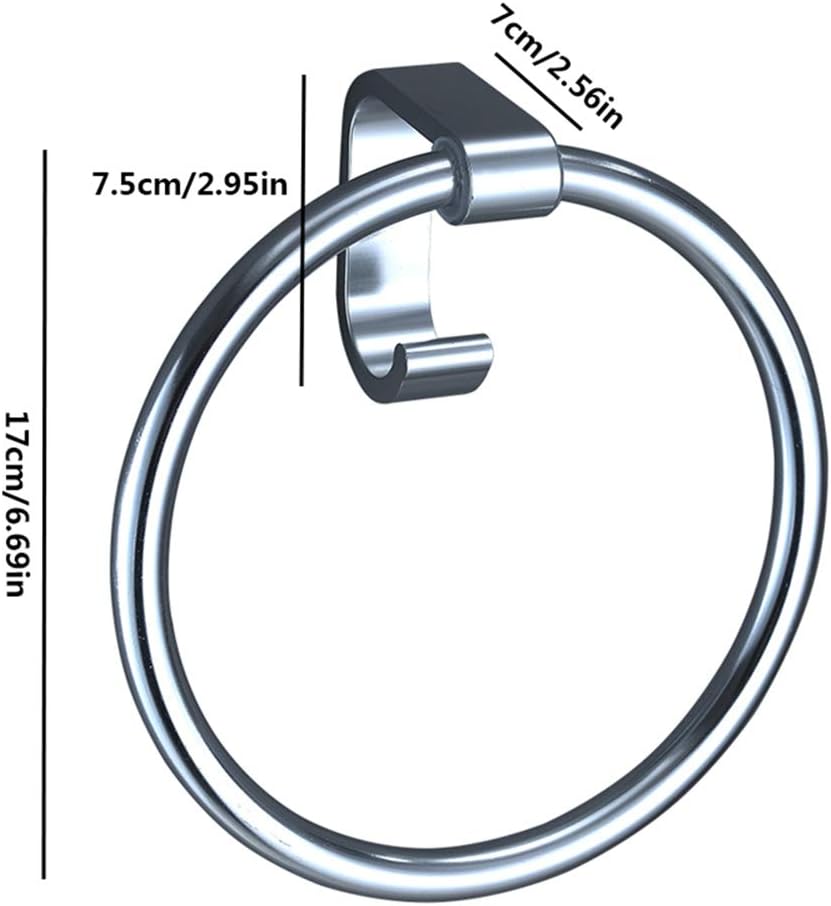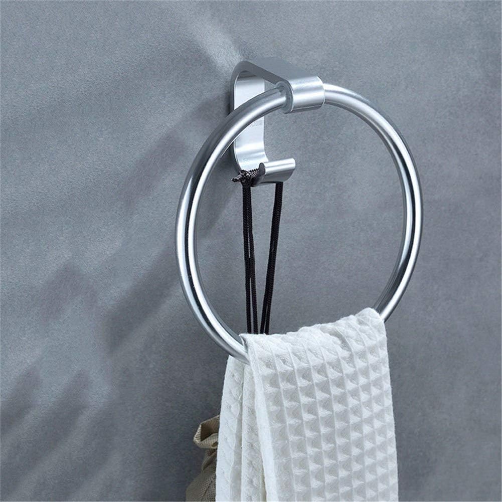 SPECIFICATION:? Product Name: Towel Ring? Size: as shown? Color: silver? Material: space aluminum? Features: thick and durable, high-quality space aluminum, hook design, punch-free, strong load-bearing, safe and comfortableDESCRIPTION:? Bathroom Towel Ring offers simple, subtle design to complement your bathroom motif. Featuring a low-key yet stylish appearance, products for a clean and unassuming style in your home.? for mounting next to bathroom or kitchen sinks for holding hand towels.? 1. Select the wall and wipe the dust and oil stains on the wall with dry towel? 2. Attach the auxiliary sticker to the front of the product? 3. Apply the glue dot on the contact surface24hours? 4. Press hard with both hands to spread the glue evenly6.24 hours after the removal of auxiliary paste, the installation is completed? 5. Wait for 24 hours. Glue setsPACKING LIST: ? 1* Towel ring