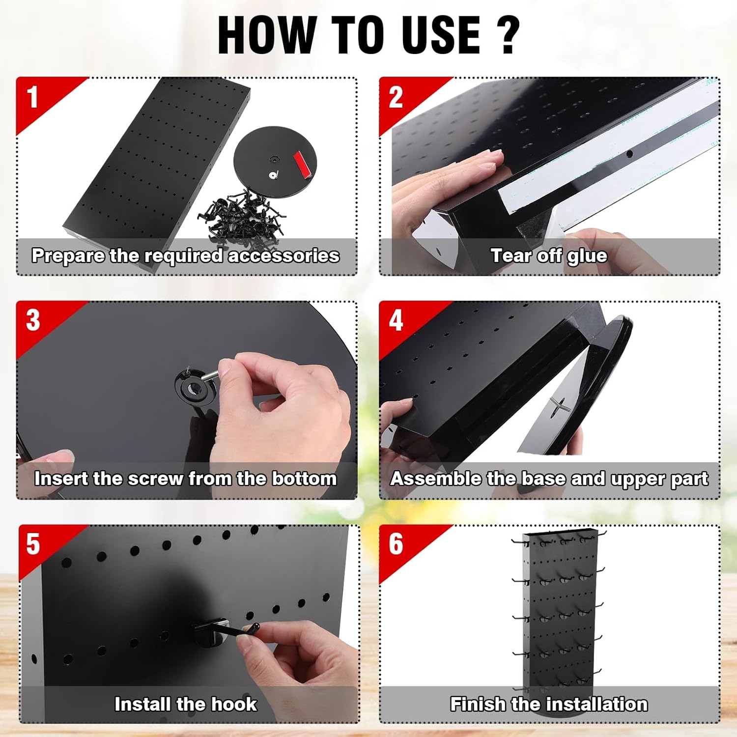 | Included Components | 1 x Black revolving four sided pegboard display stand, 54 x Black pegboard hooks |