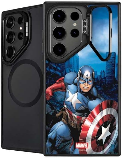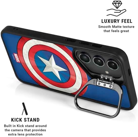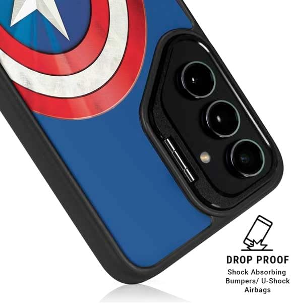 The Marvel Captain America Shield Kickstand Case compatible with Galaxy S24 Ultra is the ultimate in versatile protection and convenience. Featuring an innovative lifted camera ring with a built-in stand, it allows hands-free video watching with adjustable angles from 0 to 150 degrees. This premium Captain America Case supports wireless charging and is fully compatible with MagSafe, offering a sleek design without compromising on durability or functionality.