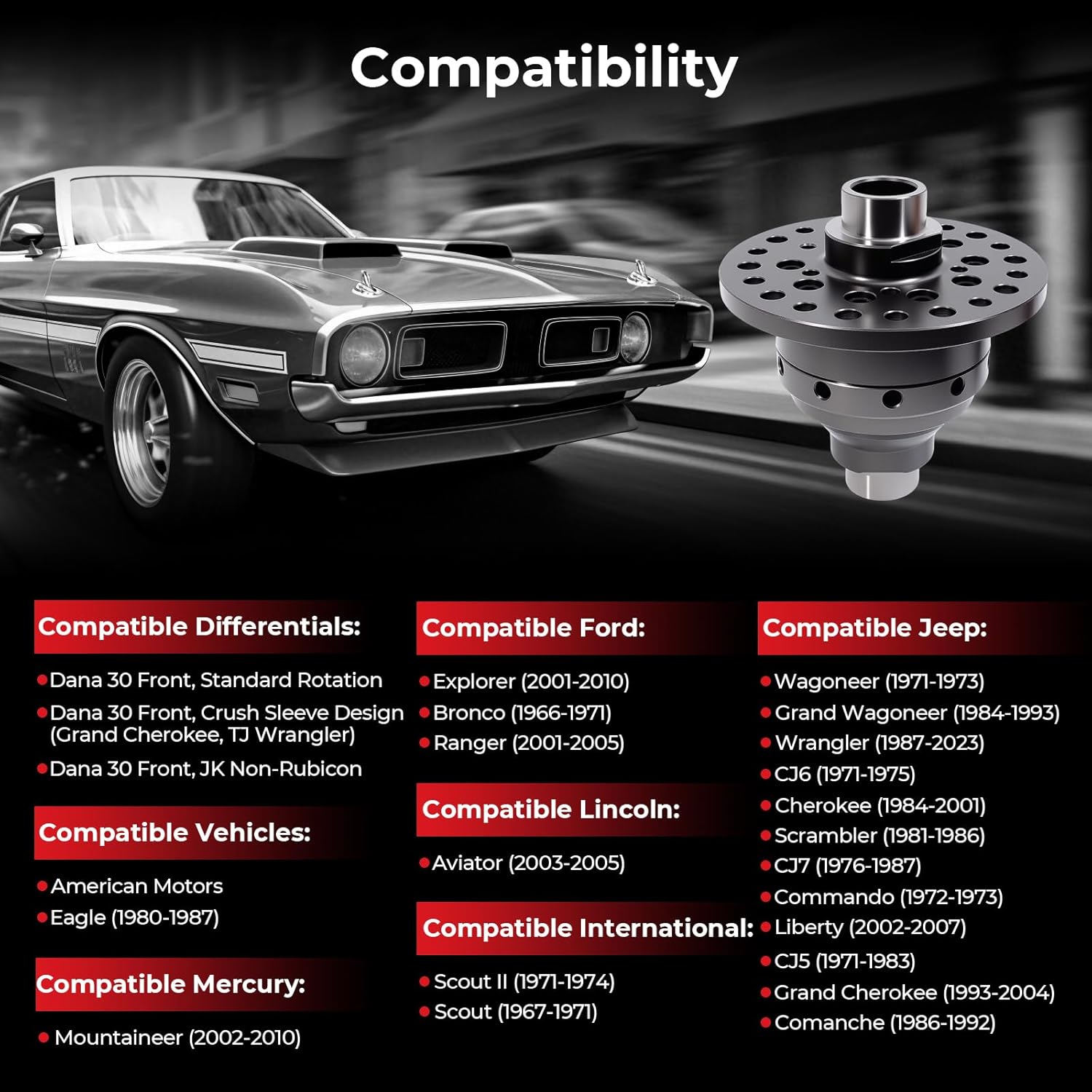 Compatible Differentials:Dana 30 Front, Standard Rotation/ JK Non-Rubicon/ Crush Sleeve Design- Grand Cherokee/ Crush Sleeve Design- TJ Wrangler. Used for Dana 30 Front, 27 Spline, 3.73+ Ratio, 10383 Standard Gear Helical; Replace SL D30-4-27-LSD.Compatible with Explorer 2001-2010Bronco 1966-1971Ranger 2001-2005International Scout II 1971-1974Scout 1967-1971Wagoneer 1971-1973Grand Wagoneer 1984-1993Wrangler 1987-2023CJ6 1971-1975Cherokee 1984-2001Scrambler 1981-1986CJ7 1976-1987Commando 1972-1973Liberty 2002-2007CJ5 1971-1983Grand Cherokee 1993-2004Comanche 1986-1992Lincoln Aviator 2003-2005Mercury Mountaineer 2002-2010American Motors Eagle 1980-1987