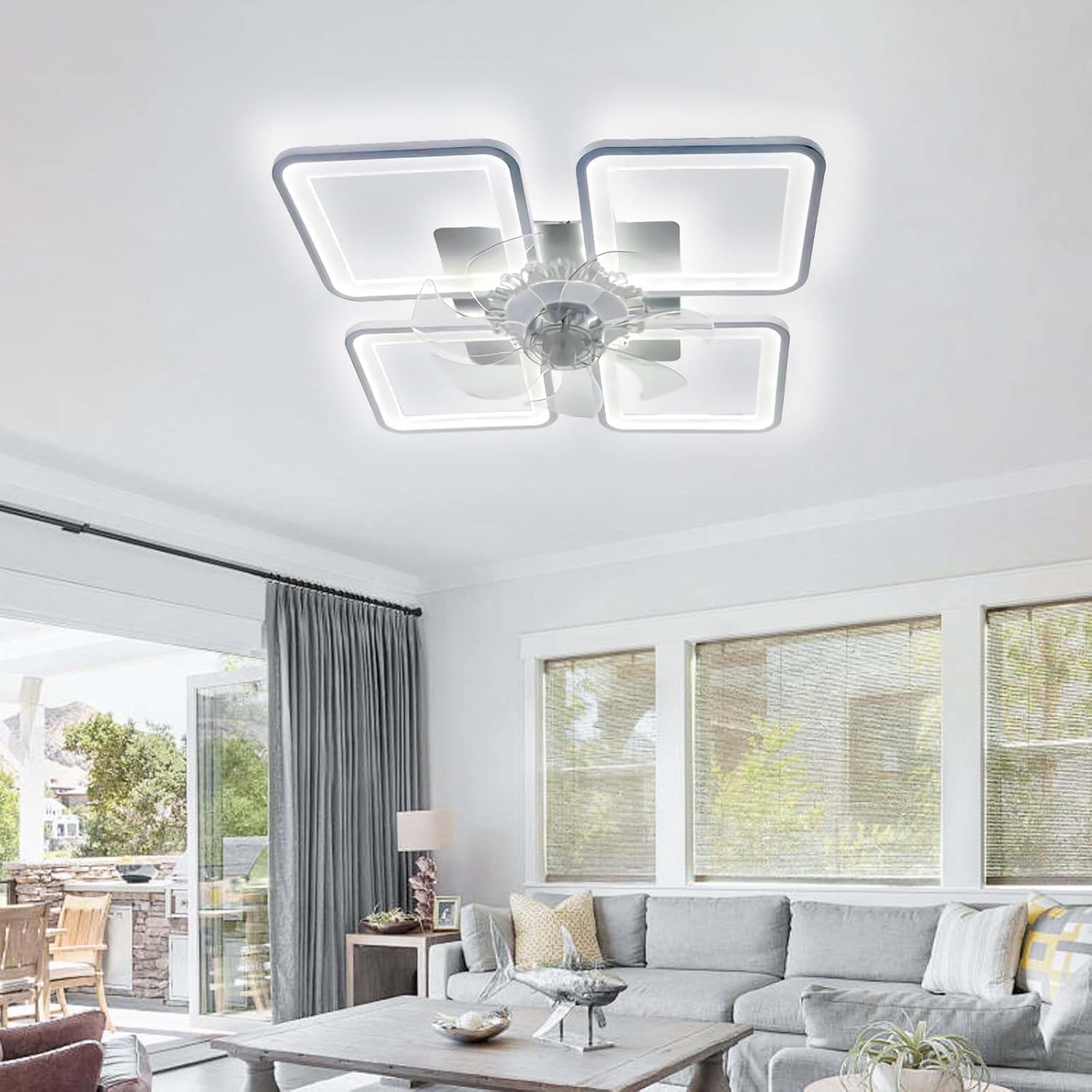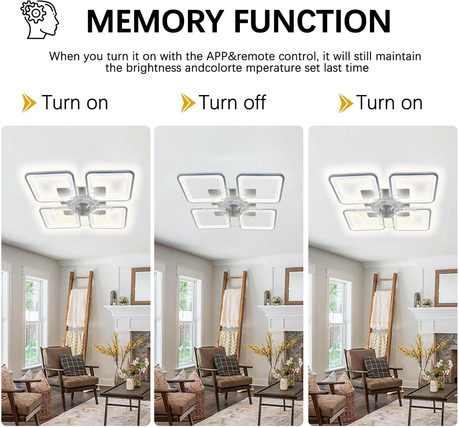 Product Details: Type:Ceiling fans with light/Ceiling lamp/Lamp with fan Dimensions: 75 x 75 x 15 cm. Color: White/Black Power consumption: 40W Material: Alloy + Acrylic Adjustable wind speed: 1-6 levels Adjustable brightness: 20%-100% Timer: 0-8 hours (via app) Voltage: 110V-240V Applicable area:8-10m2 Suitable for: Living rooms, dining rooms, hotel rooms, children's rooms, offices, etc. Includes Components: 1 x ceiling fan with lights 1 x mounting hardware 1 x Remote Control 1 x User Manual Tips Please note the dimensions before purchasing. Due to manual measurement, please allow 1-2 cm difference. Pictures may have normal color variations due to different shooting angles and lighting conditions. Make sure the device is turned off before installation.