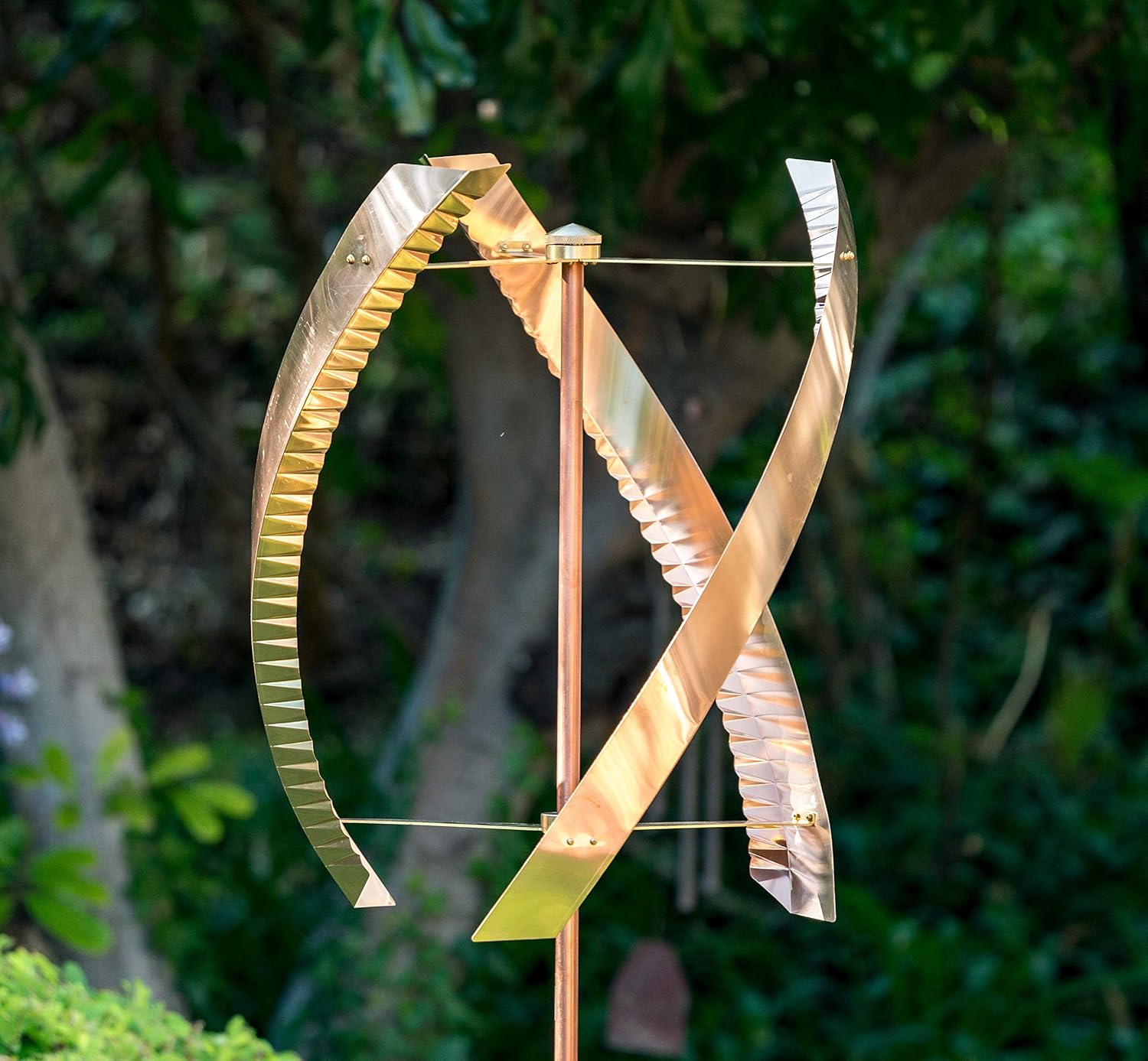 For sale is a kinetic copper wind sculpture with Three Blades Standing United. The entire wind sculpture including the pole and its fixture is made of pure copper with brass hardware. The stainless steel ball-bearing within the brass hardware allows the triple blades to spin in a slight breeze. The pole is made of heavy gauge copper and secured into the ground by an all copper 4-point anchoring system. With its heavy-duty construction, this kinetic sculpture can withstand strong winds up to 70 mph. The wind catchers and arms are not coated and will age naturally. If you want to preserve its original copper shine, you may spray a layer of clear coat on it. We have had great success with clear coats made by Rust-Oleum (Crystal Clear Enamel) or Permalac (Original Clearcoat Lacquer Satin). The craftsmanship of this kinetic sculpture is impeccable. The sculpture is entirely weatherproof and made to last for decades. We proudly back this beautiful wind sculpture with a lifetime warranty. Size: The entire sculpture (above ground portion) is about 6 ft tall. The spinner head is 28" tall and 24" in diameter.