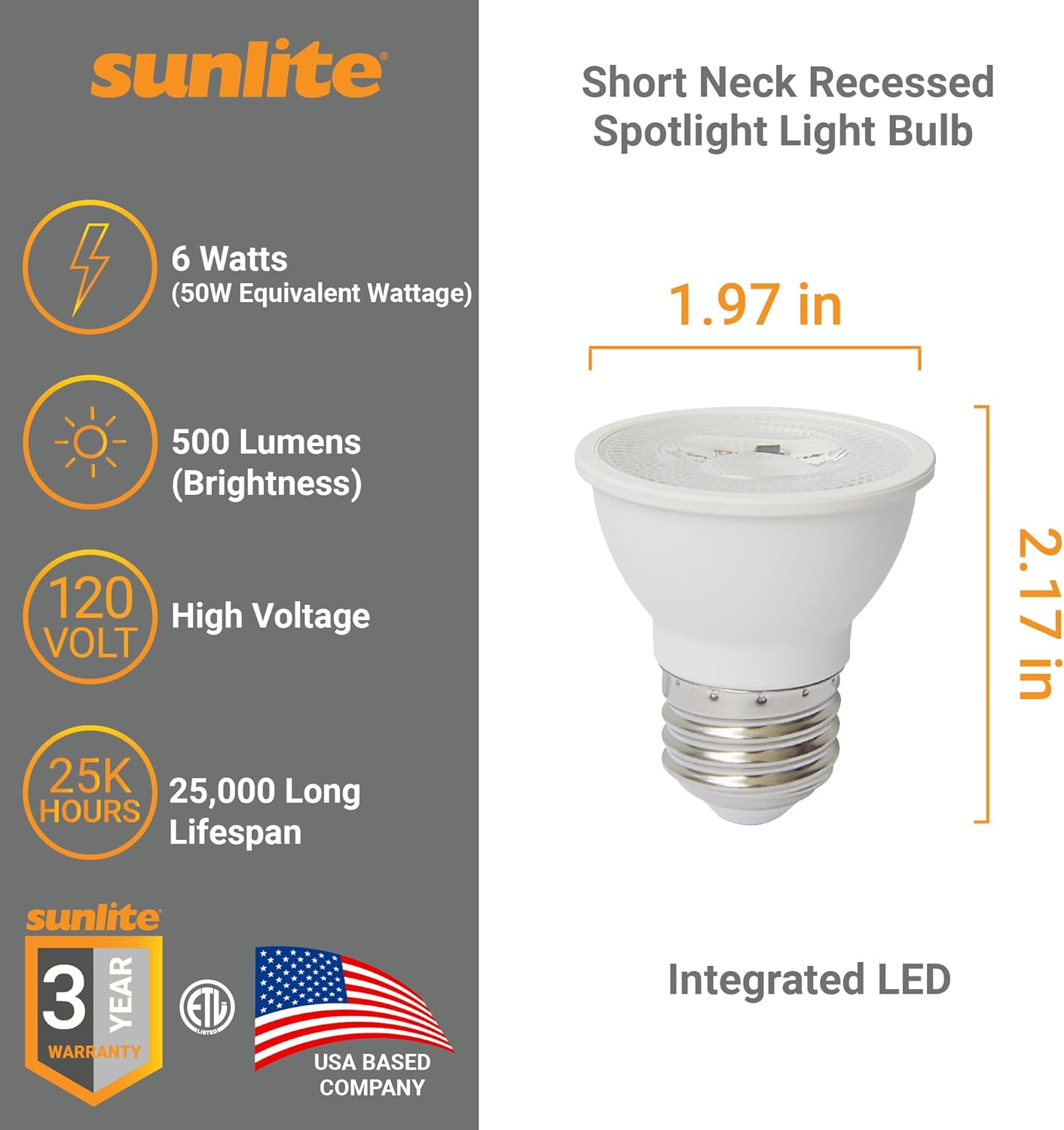Sunlite PAR16 Shortneck LED Bulb – Dimmable – 25,000 Hour Lifespan – Energy Saving – 75% Energy ReductionFrom the moment you switch on the Sunlite PAR16 Shortneck LED Bulbs, enjoy flicker-free, dimmable lighting designed to create the perfect ambiance in any room.Flicker-Free & Dimmable LightingThese bulbs deliver smooth, flicker-free light with dimming capability, allowing you to set the ideal tone in living rooms, kitchens, bedrooms, or any space.Targeted Brightness for Style & AmbianceDesigned for direct and focused illumination, these PAR16 LED bulbs enhance the atmosphere with unique style and clear, bright light.Energy & Cost SavingsSave up to 75% on your annual energy bill compared to traditional bulbs, helping you reduce your electricity costs significantly.Long-Lasting PerformanceBoasting a 25,000-hour lifespan, these bulbs reduce the hassle of frequent replacements, especially in hard-to-reach fixtures.Trusted Quality & WarrantySunlite provides premium bulbs and fixtures engineered for durability and optimal performance, backed by a 2-year manufacturer warranty for peace of mind.Specifications:• Bulb Type: PAR16 Shortneck LED• Dimmable: Yes (Flicker-Free)• Lifespan: 25,000 Hours• Energy Savings: Up to 75% Reduction• Application: Living Room, Kitchen, Bedroom, Office, Workplace• Warranty: 2 Years Manufacturer WarrantyChoose Sunlite PAR16 Shortneck LED bulbs for stylish, energy-efficient, and reliable lighting that enhances your home or workspace effortlessly.