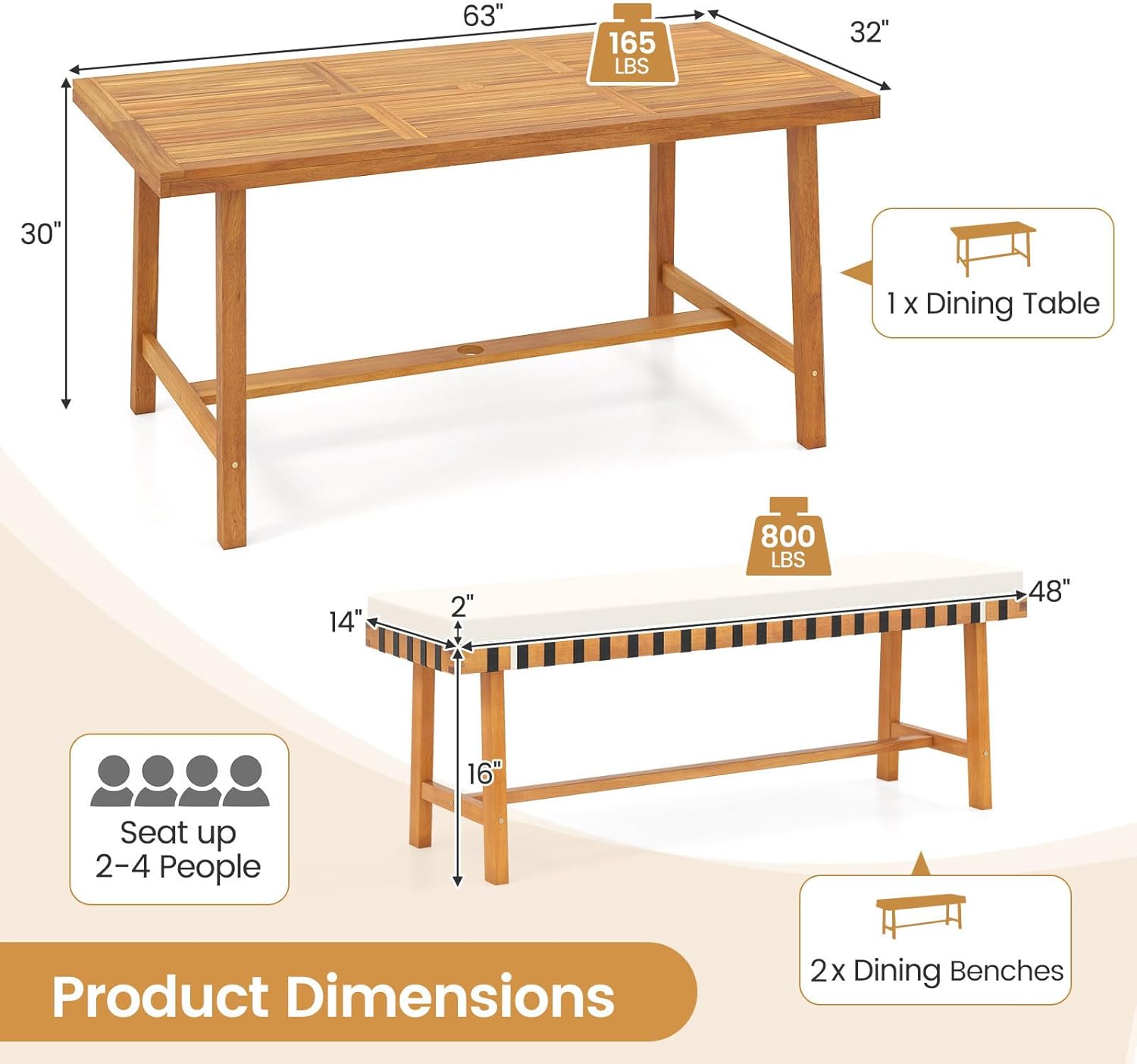 Features:Please avoid leaving it outdoors in the rain to extend its lifespanIncludes a rectangular table and 2 benches, elevate your outdoor gatheringsCrafted of solid acacia wood, warp-resistant, sturdy and reliable, built to lastWith delicate craftsmanship, it features a smooth and splinter-free surfaceThe H-shaped reinforced crossbars provide exceptional strength and stabilityFeatures a 1.97”/5 cm umbrella hole for an easy setup of a sunshadeEquipped with an additional bottom holder, securely hold your umbrellaEquipped with a wood block to protect the hole, enhance its service lifeThe slatted tabletop promotes ventilation, easy to clean and maintainThe thick padded seat cushions offer optimal comfort and support for relaxationThe padded cushions feature a detachable zippered cover, easy to cleanThe cushions feature fixing straps, easy to secure and detach to the chairsDesigned with woven rope bench seats to promote ventilation and comfortIdeal for various settings such as outdoor dining areas, porch, terrace, or gardenAssembly neededPlease apply wood polish oil (not included) to the wood surface regularlySpecifications:Color: Natural+Off WhiteMaterial: Acacia Wood, Weaving Ropes, Polyester Fabric, SpongeTable Size: 63” x 32” x 30”/160 x 80 x 75 cm (L x W x H) Bench Size: 48” x 14” x 18”/120 x 35 x 45 cm (L x W x H)Seat Height (Without the Cushion): 16”/40 cmCushion Thickness: 2”/5 cmDiameter of the Umbrella Hole: 1.97”/5 cmWeight Capacity of the Table: 165 lbs/75 kgWeight Capacity of Each Bench: 800 lbs/360 kgNet Weight: 68.5 lbs/31 kgPackage Includes:1 x Acacia Wood Table2 x Acacia Wood Benches2 x User’s Manual