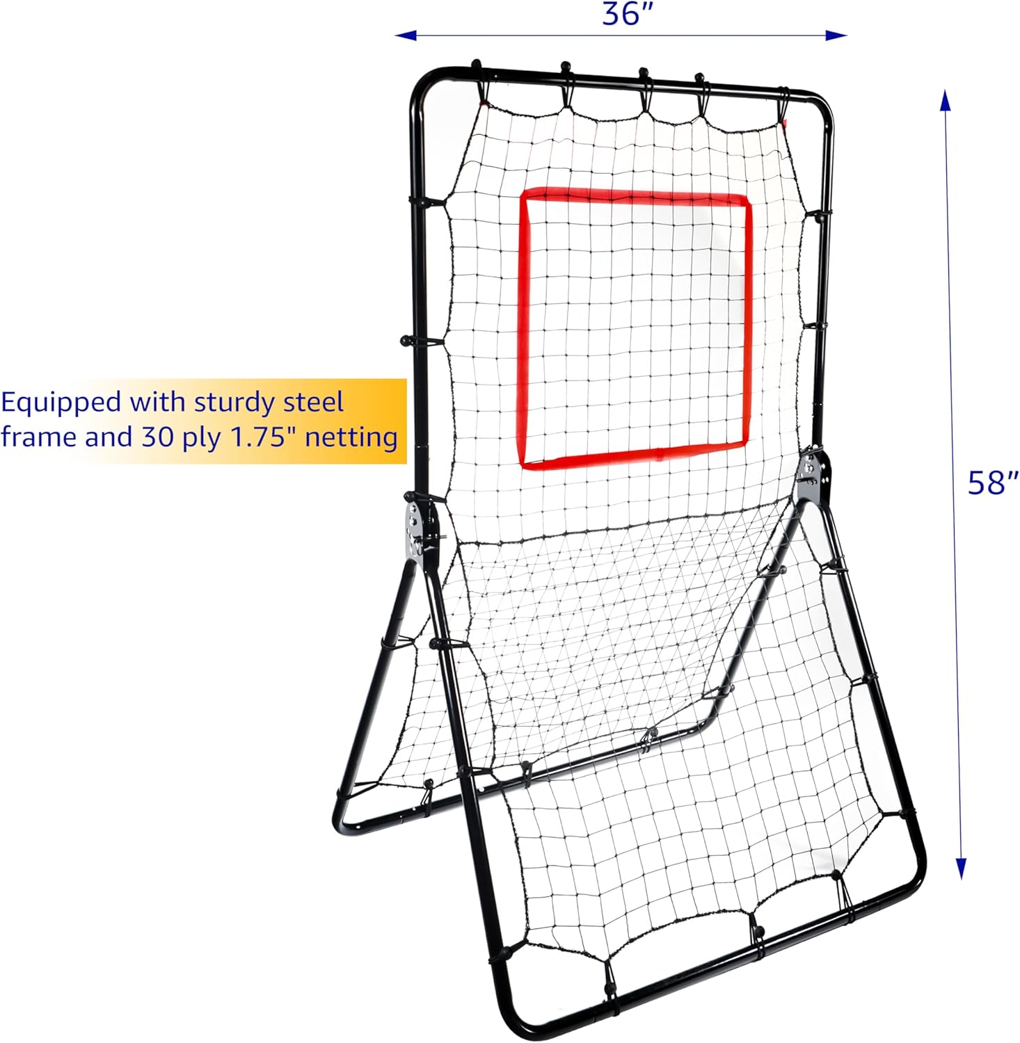 This multi-sport pitchback net has a sturdy steel frame and 30 ply 1.75" netting. It measures 36"W x 58"H (straight height) and the angle is fully adjustable. A versatile tool to help improve skill and accuracy for baseball, softball, soccer and other sports. The net comes with metal stakes to keep it in place. Easy set up instructions included. By Trademark Innovations.