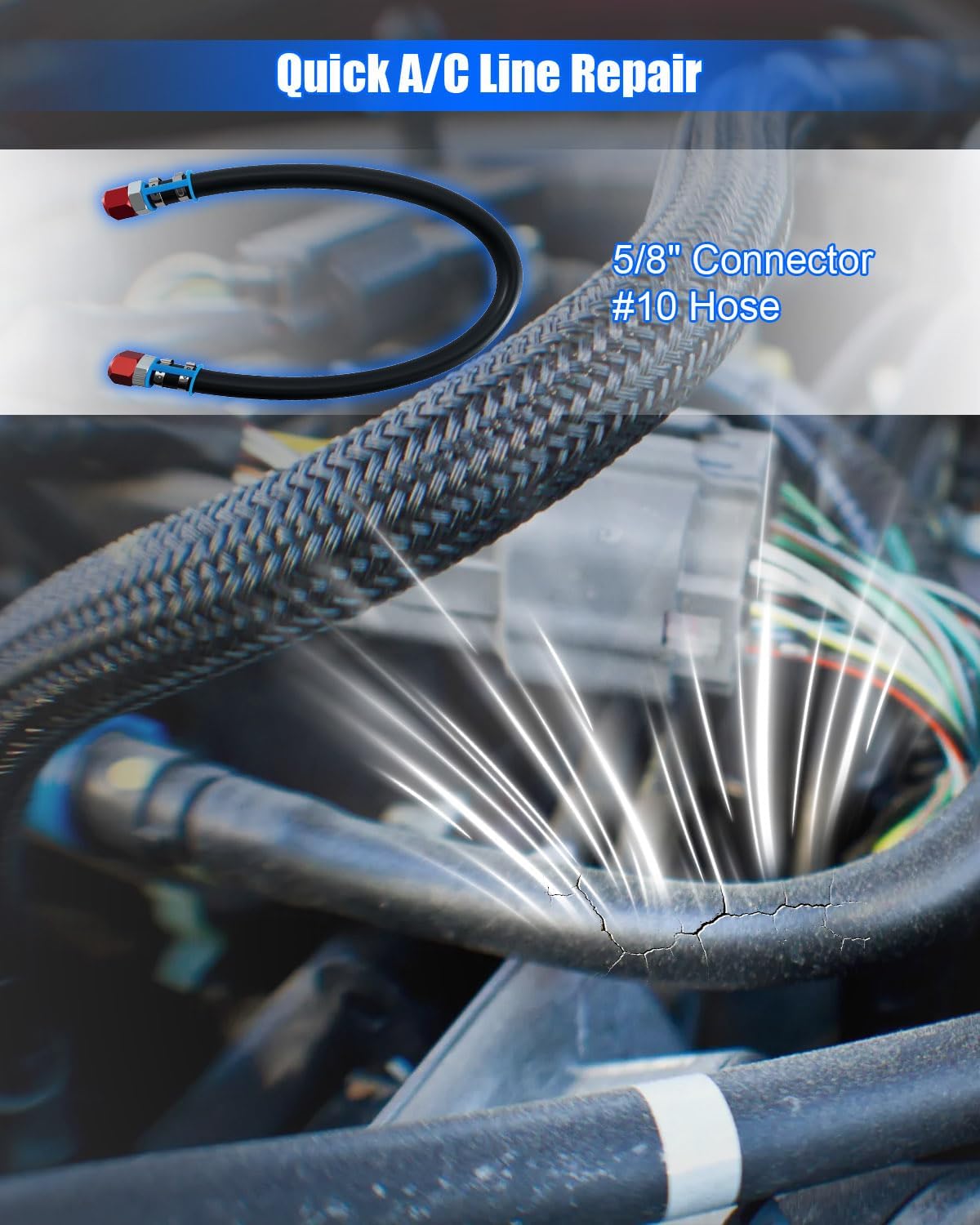 This 5/8" A/C line repair kit restores leaksFix refrigerant issues caused by aging, corrosion, or vibrationNo need to replace the entire systemRestore proper seal and cooling performance fastConnects 5/8 inch aluminum or steel A/C linesWorks with #10 hose for most vehicle A/C systemsDirect replace 800-670Made from high-quality, durable materialsResists corrosion, heat, and high pressureEnsures reliable, long-lasting performanceSimple plug-and-play installationRemove the damaged section and insert the hoseSecure with provided fittings in just minutesComplete kit includes all required components1x #10 hose (24”)2x red lock nuts2x Fittings4x hose clamps2x Clamp brackets2x sealing sleeves2x Vibration tension rings