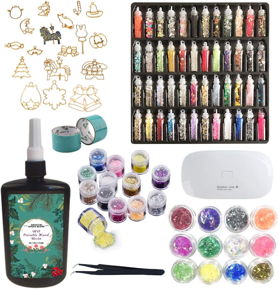 | Included Components | UV-curable epoxy resin, mini UV lamp, tweezers, set of 48 decorations, 12 sequins, 12 glassine, 17 open back bezels, 2 tapes, 2 molds with 25 shapes for making pendants, 1 mold with 10 shapes for making pendants & earrings etc. |