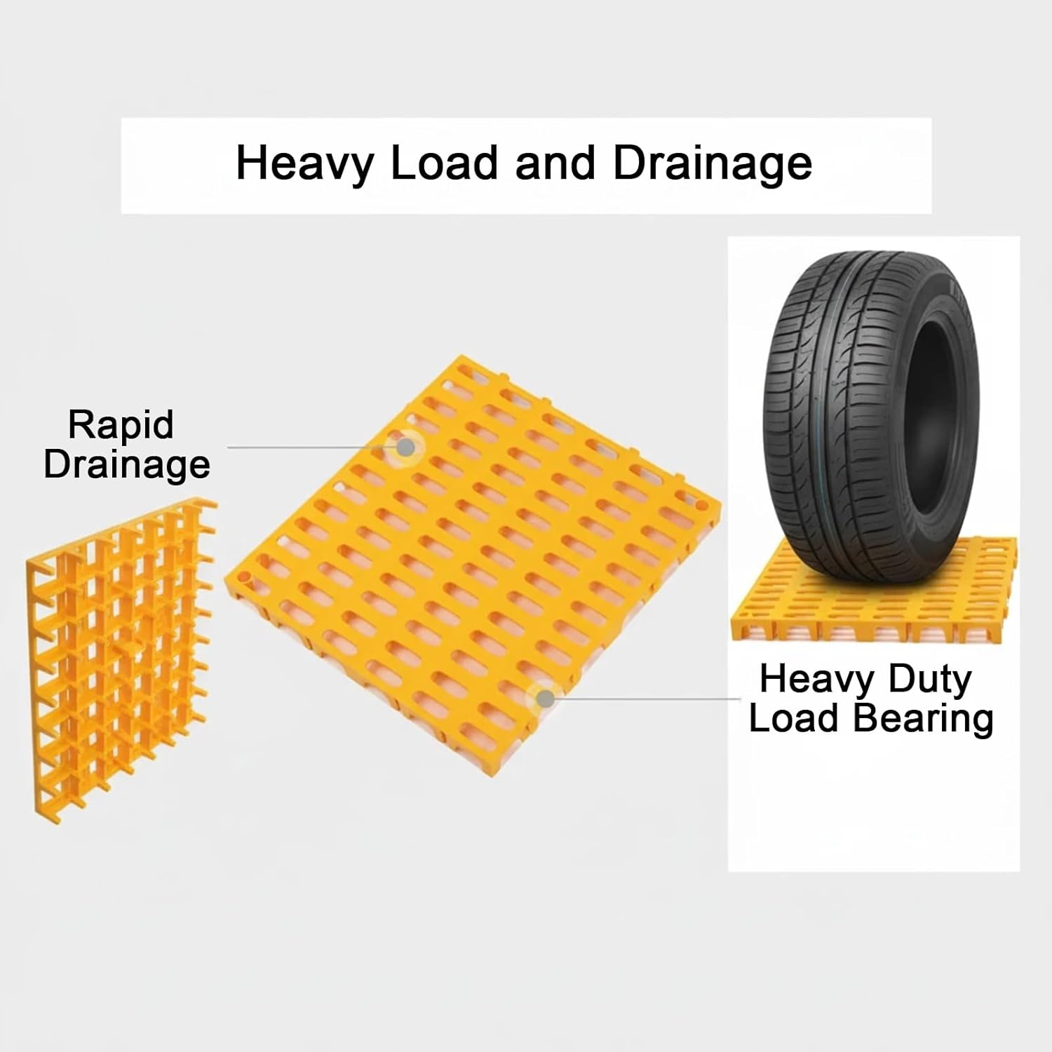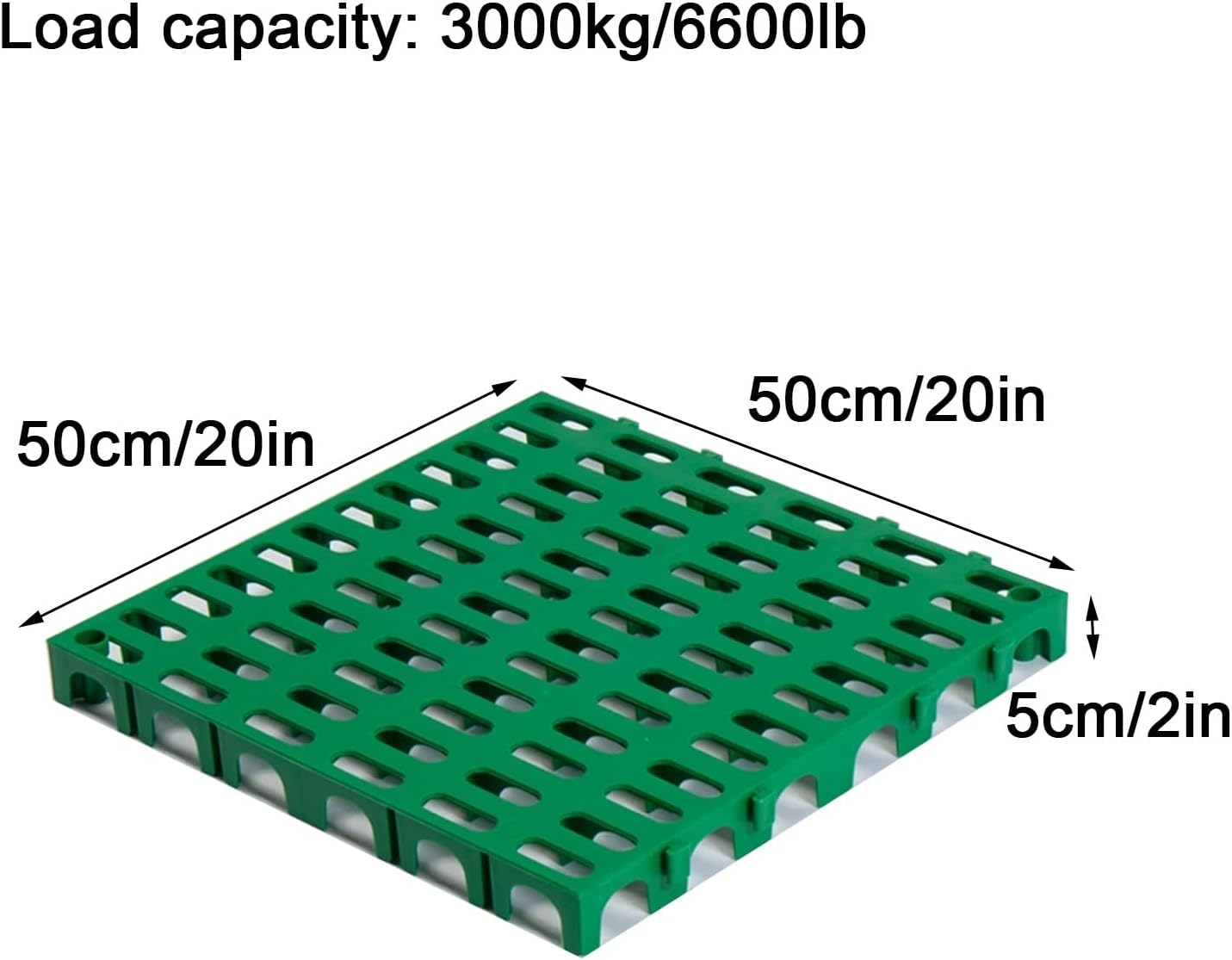 Product Description:Whether it's heavy equipment in a home garage, seasonal storage in a basement, or goods stacking in a commercial warehouse, damp floors and load-bearing safety are always two major concerns. We bring you this heavy-duty moisture-proof mat, specifically designed to handle demanding storage environments.Key Advantages:One-piece Injection Molding:Made from high-density polyethylene (HDPE) using one-piece injection molding, the material itself possesses excellent heat and cold resistance, remaining undeformed in environments from -30℃ to 70℃.Anti-slip Design:The surface features a grid design with embedded anti-slip particles, significantly increasing surface friction.Interlocking Design:The edges are designed with precise buckles and slots, allowing multiple mats to be quickly joined together to form a large, seamless platform.Efficient Moisture-proof and Ventilation:The three-dimensional frame and U-shaped hollow holes at the bottom create a four-sided ventilation system, keeping goods isolated from the ground.Product Specifications:Name: Heavy-duty Moisture-proof Plastic MatMaterial: High-density polyethylene (HDPE)Color: Gray, Yellow, Red, Green, Blue, BlackDimensions: 50×50×5cm / 20×20×2inLoad Capacity: 3000kg / 600lbInstallation Method: Interlocking buckle systemFeatures: Moisture-proof, Ventilated, Wear-resistant, Pressure-resistantPackage Includes: Heavy-duty Moisture-proof Plastic Mat x 1 piece